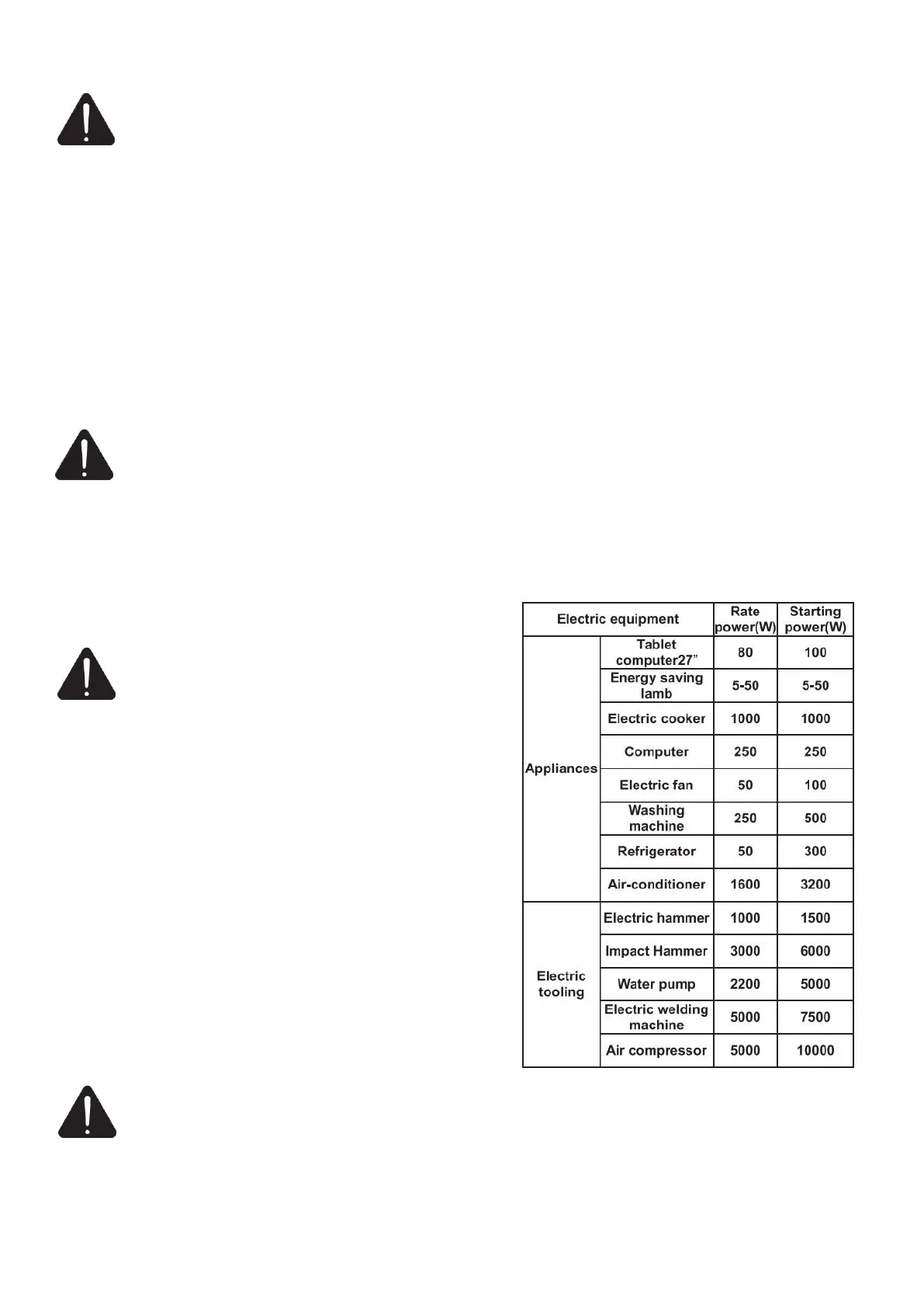 ● If the generating set supplies for several loads or electric devices, start the smallest one first and the