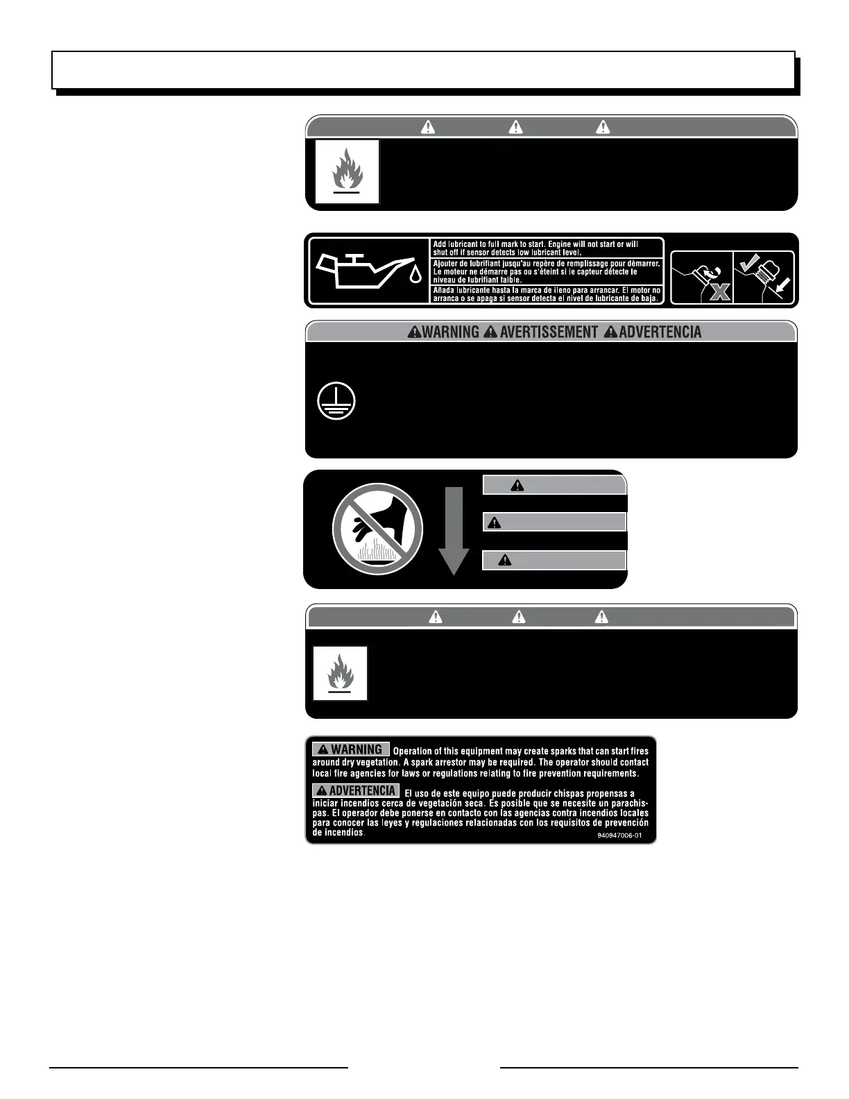 Risk of Fire. Check for any fuel overflow or leaking. Stop the engine before refueling.