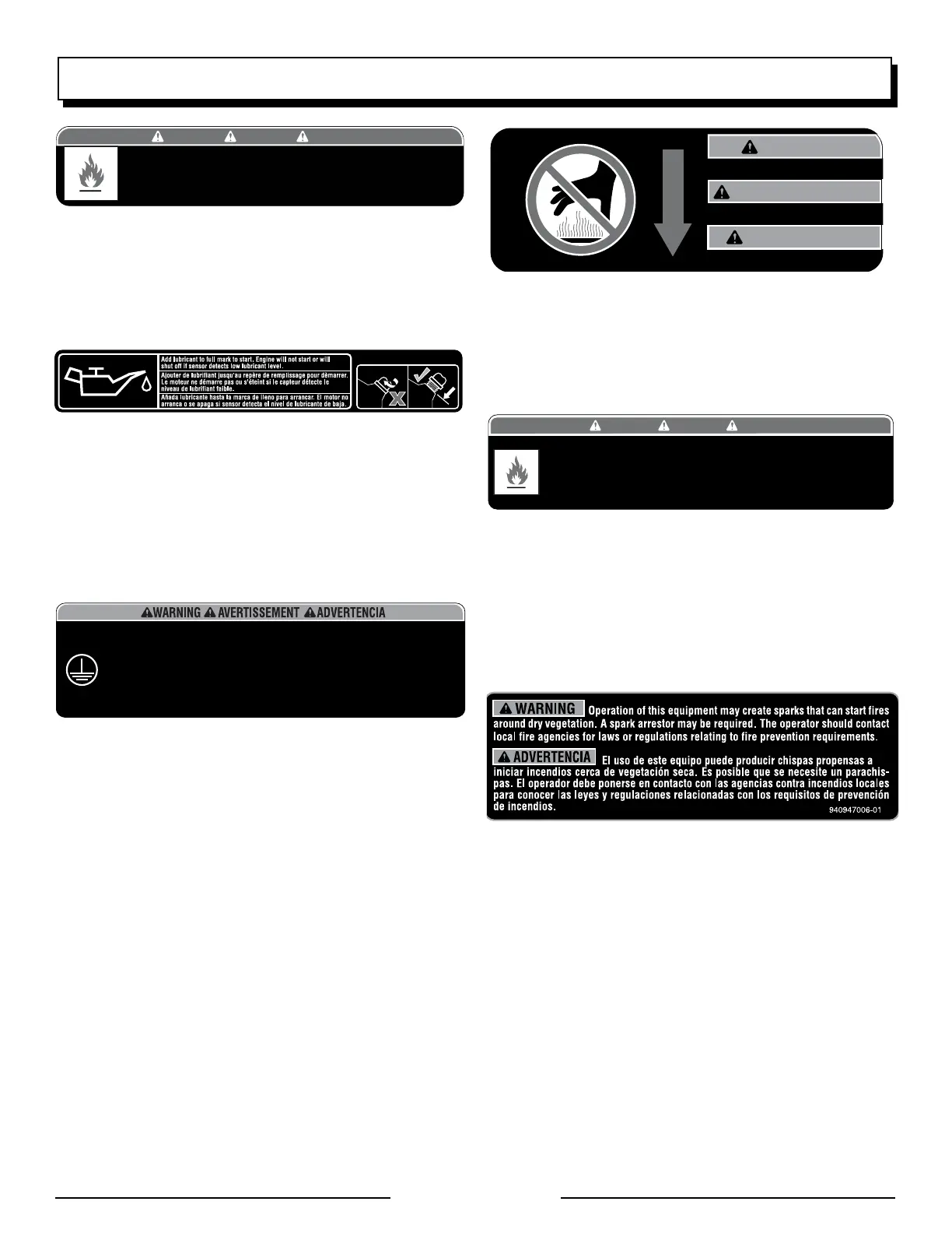 Risk of Fire. Check for any fuel overflow or leaking. Stop the engine before refueling.