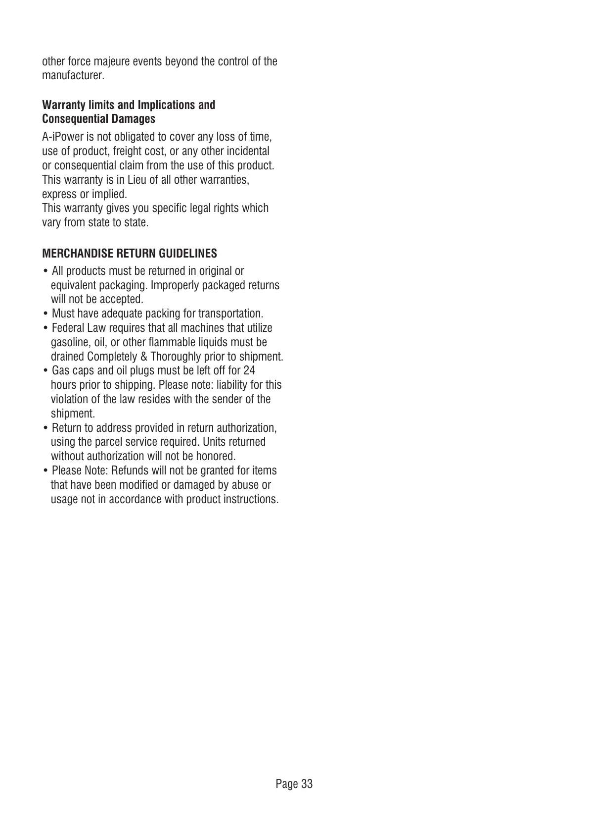 A-iPower is not obligated to cover any loss of time,