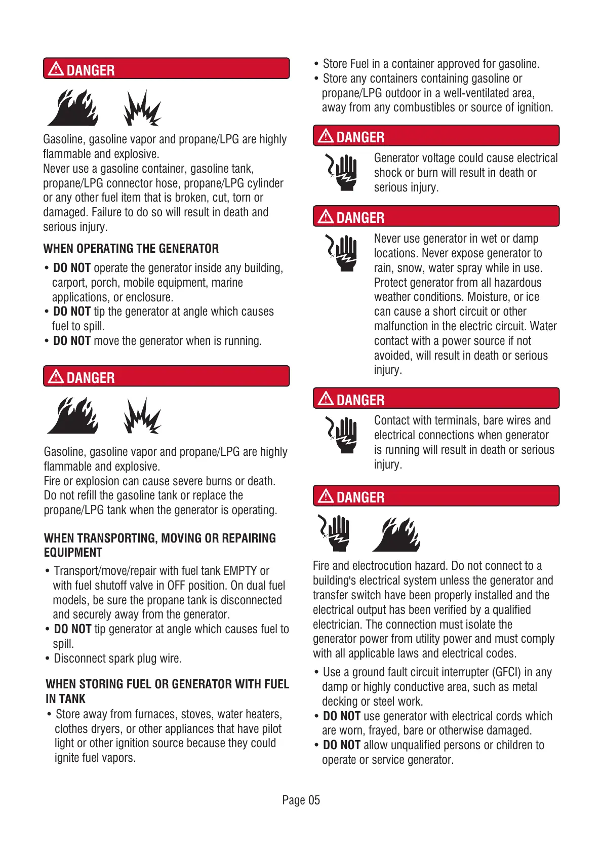• DO NOT tip generator at angle which causes fuel to