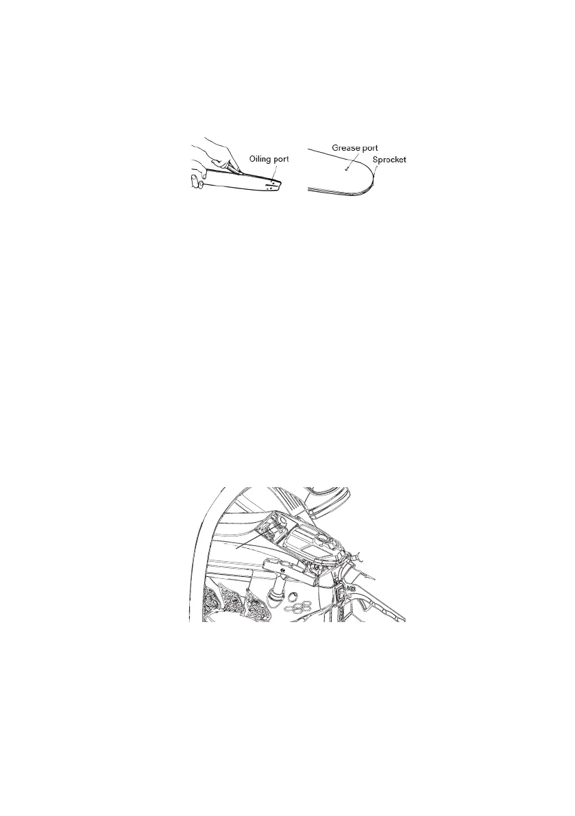 When the chain bar is dismounted, remove sawdust from the bar