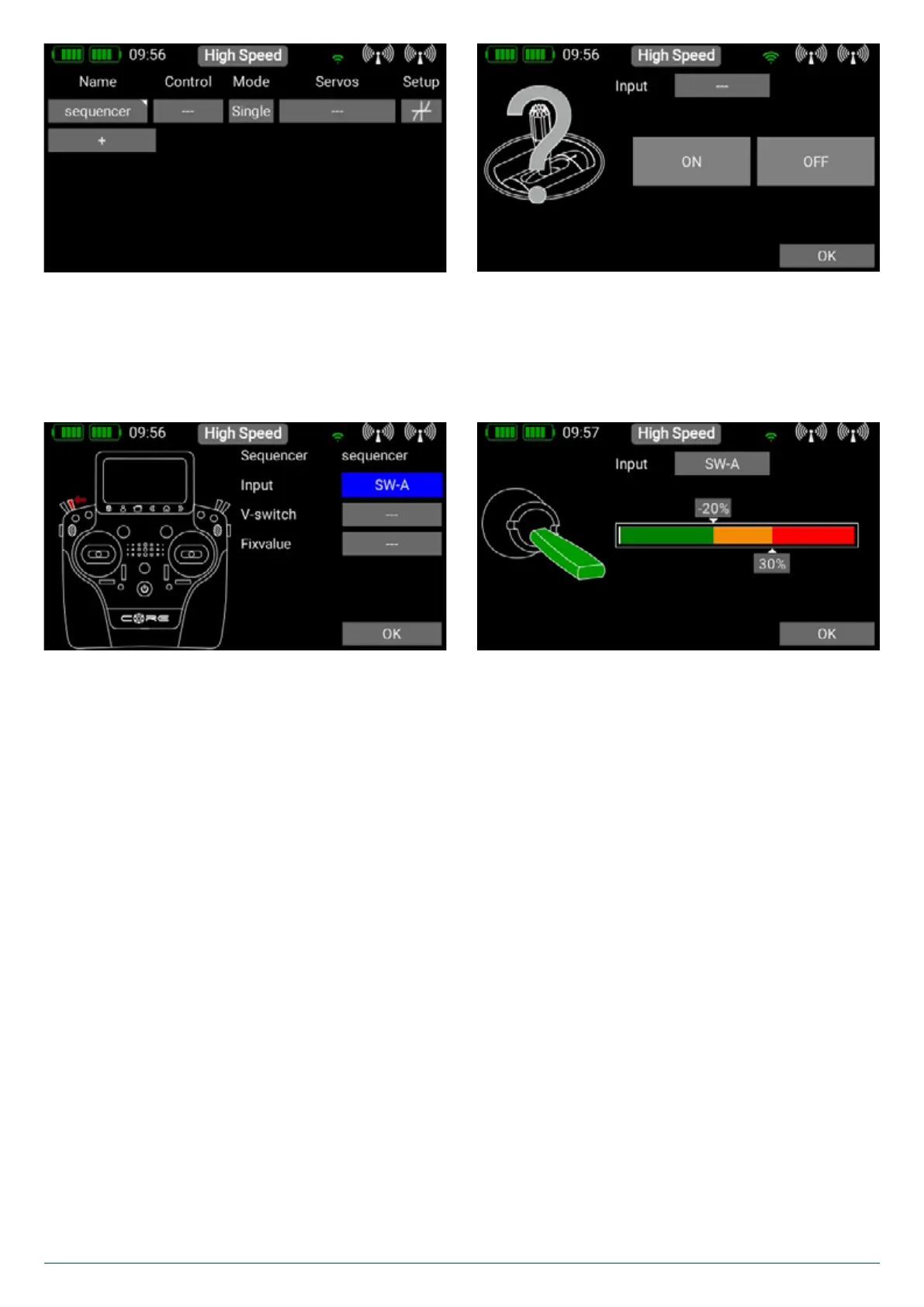 To set up a sequence, press + in the menu, and the following display appears. The first step is to select a Transmitter control.