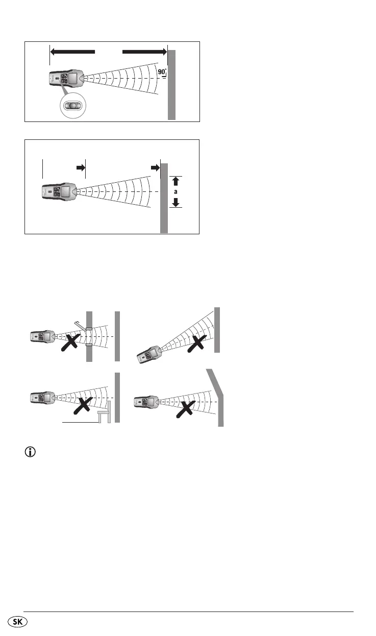 (obr. 2). Dajte preto pozor, aby bol merač vzdialeností vždy kolmo voči rovnej ploche (obr. 1 a 3).