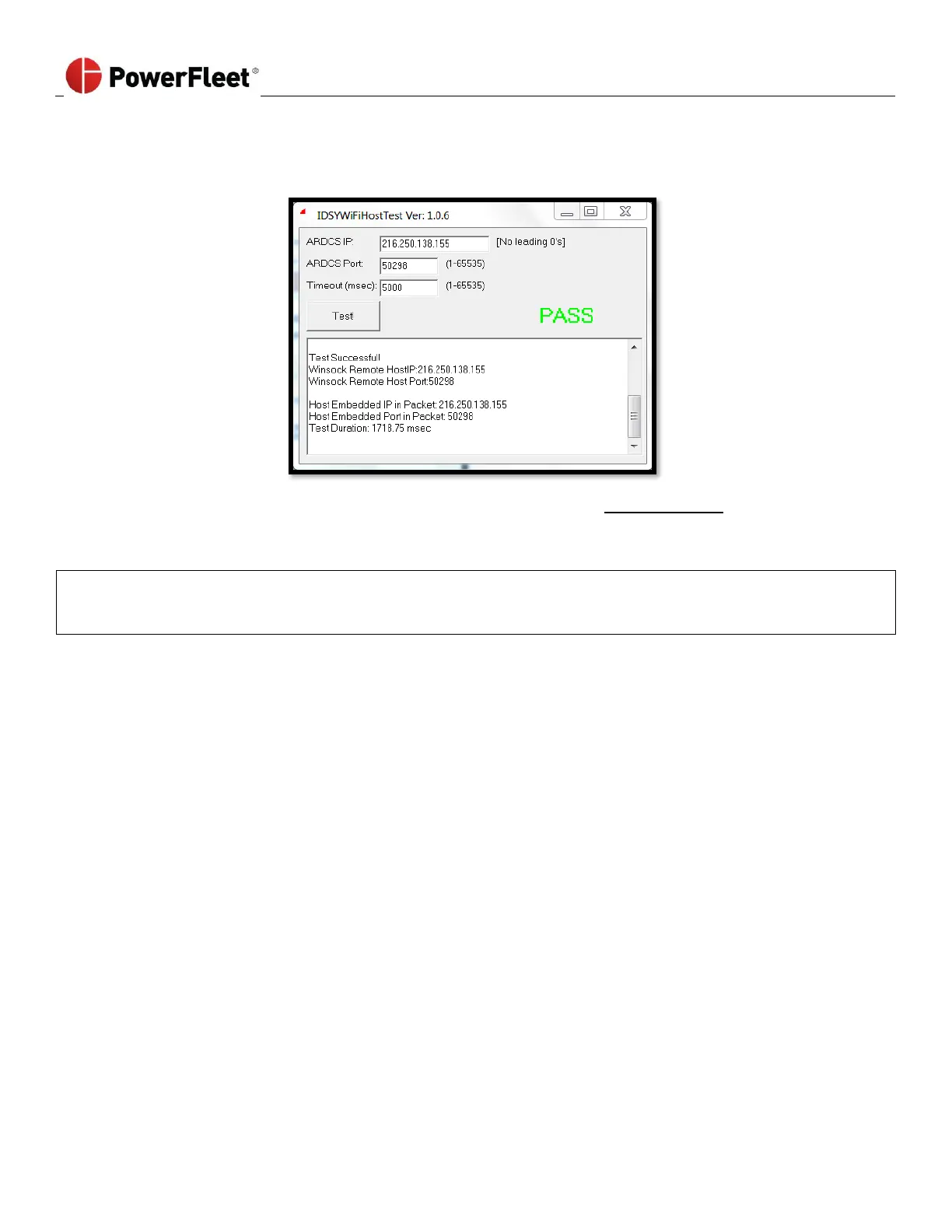 Please send a screen capture of the successful or failed test screen to PowerFleet Support: