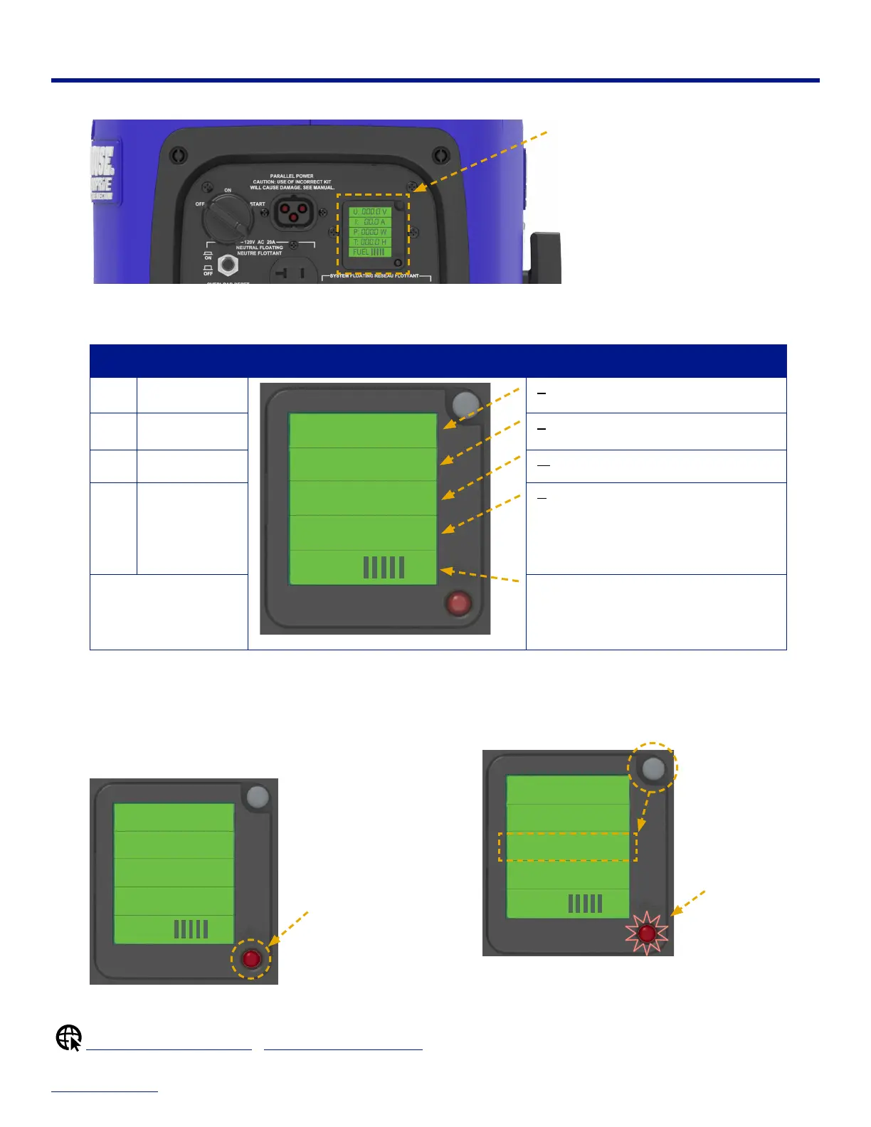 When the generator is running, the LCD illuminates to display real-time data for voltage, amps, watts, total hours of