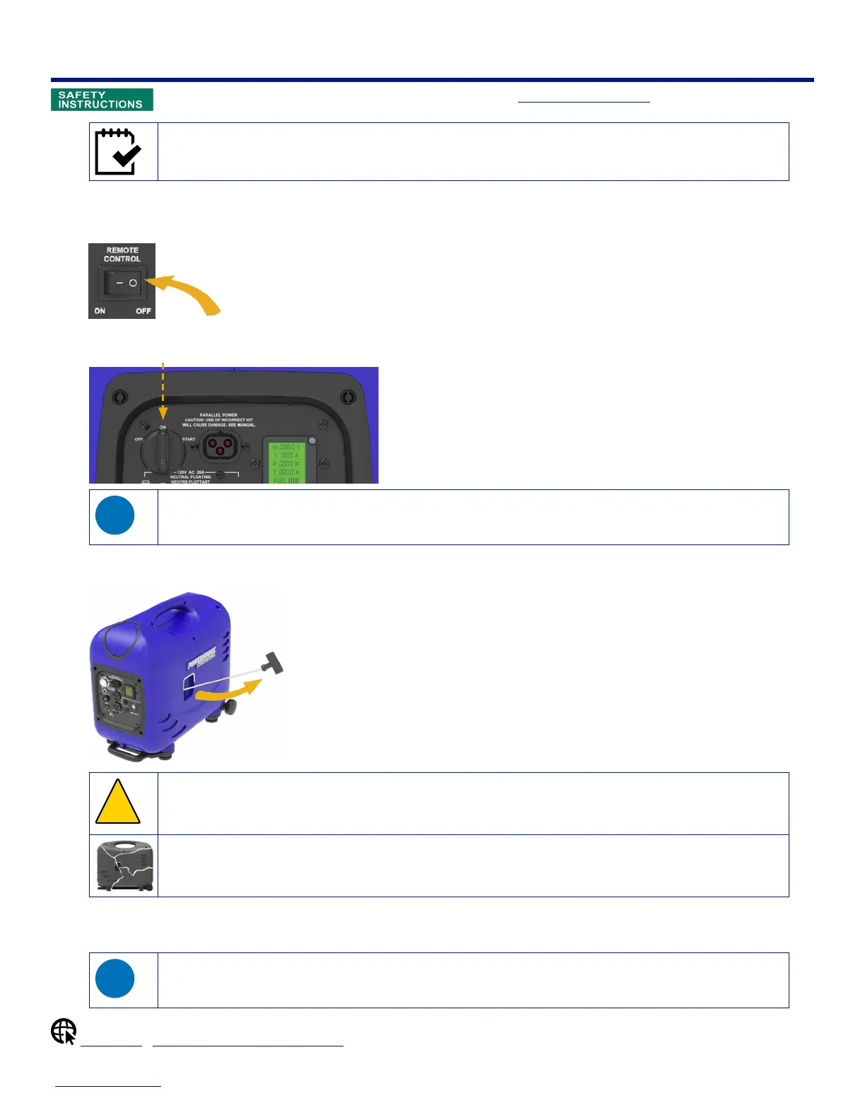 ▲ Before using the generator, read and comply with all Safety Alerts and Icons.