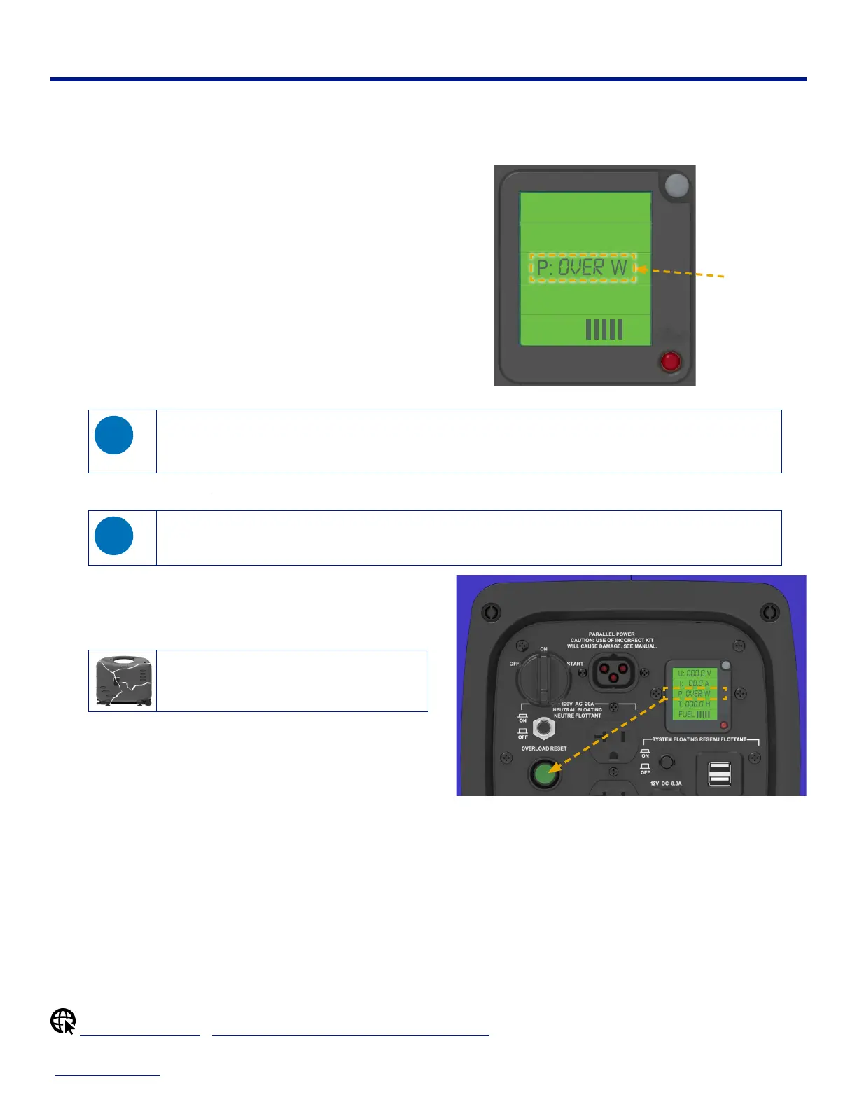 (2400W), or by a short in a connected appliance. When an excessive power load is detected, the generator alerts you