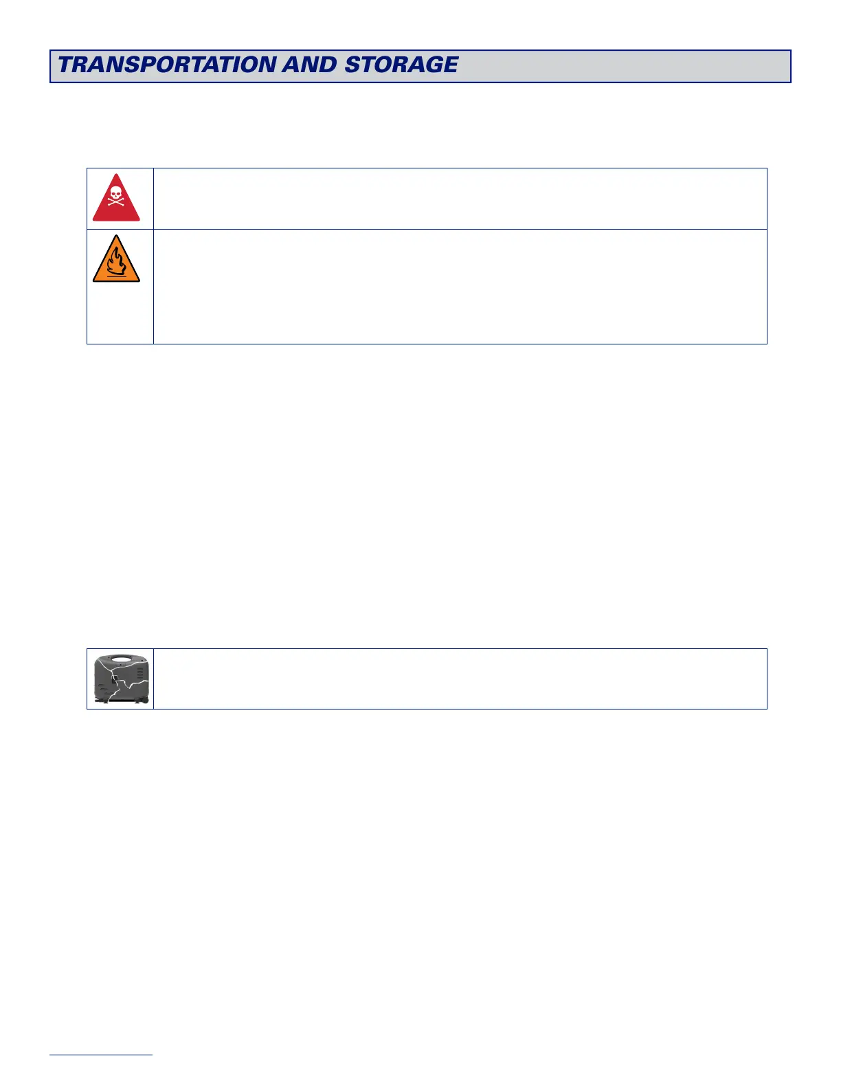 ▲ Avoid storing the generator in an enclosed area or vehicle. Gasoline is extremely flammable and explosive