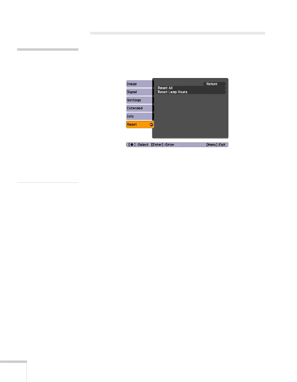 The Reset menu lets you return most projector menu settings to their