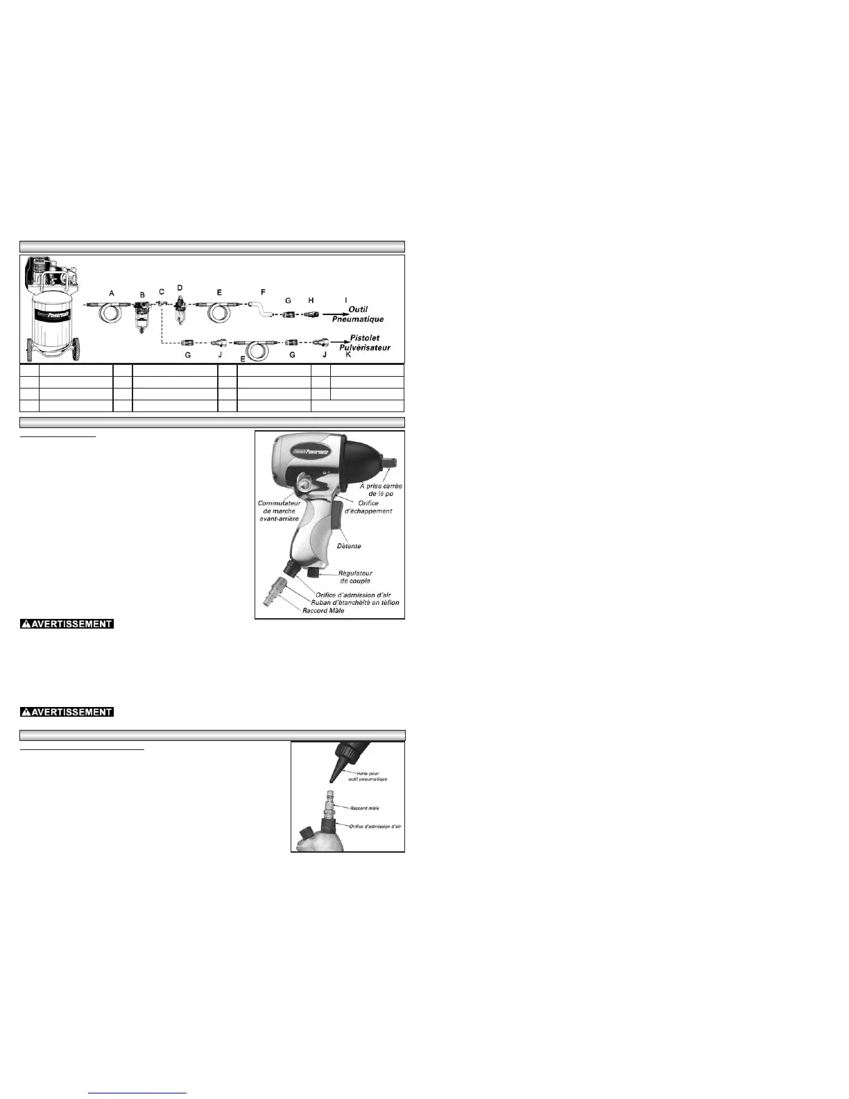 A Tuyau flexible d'air D Huilier sur canalisation G Raccord rapide J Raccord femelle