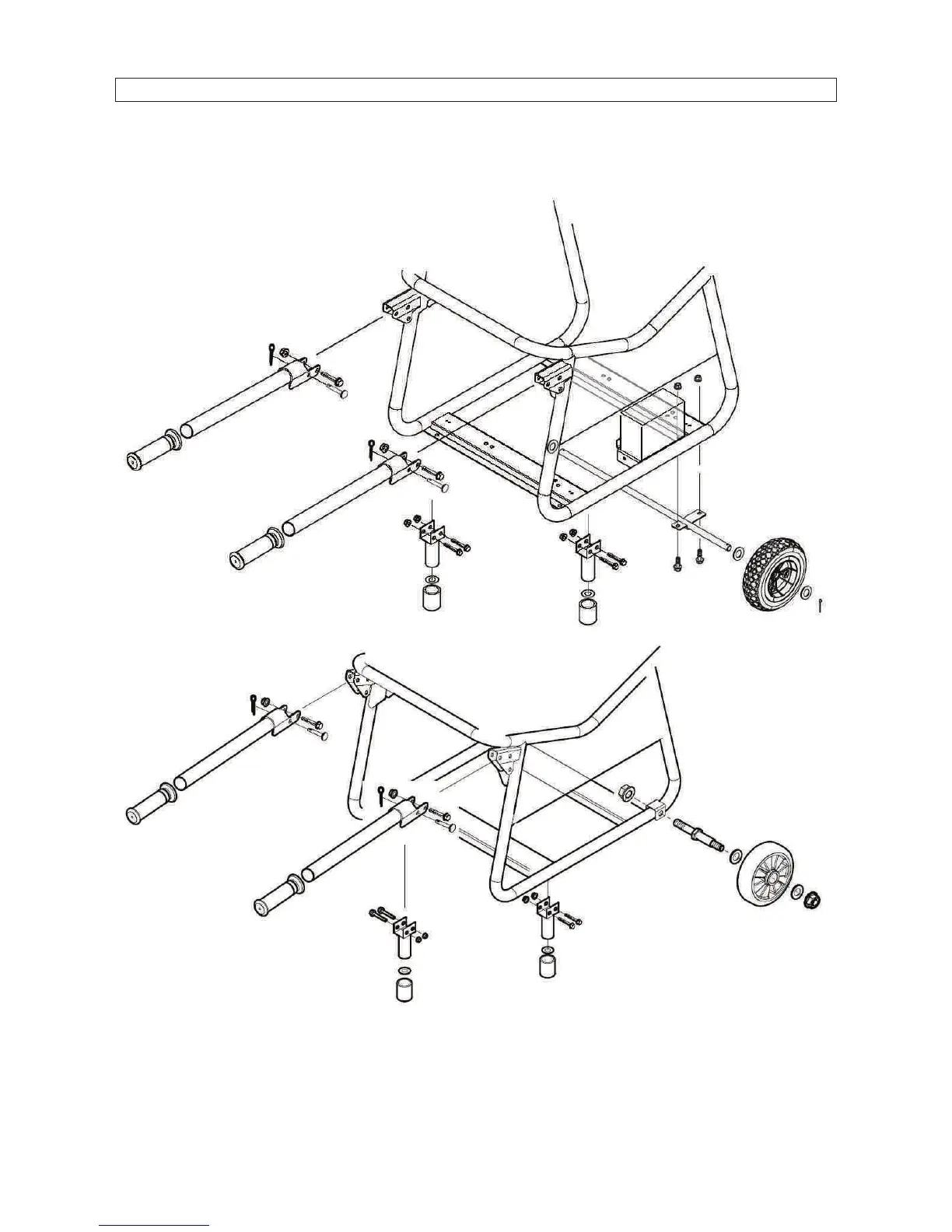 1. Install the two wheels on the wheel axle with gaskets and pins.