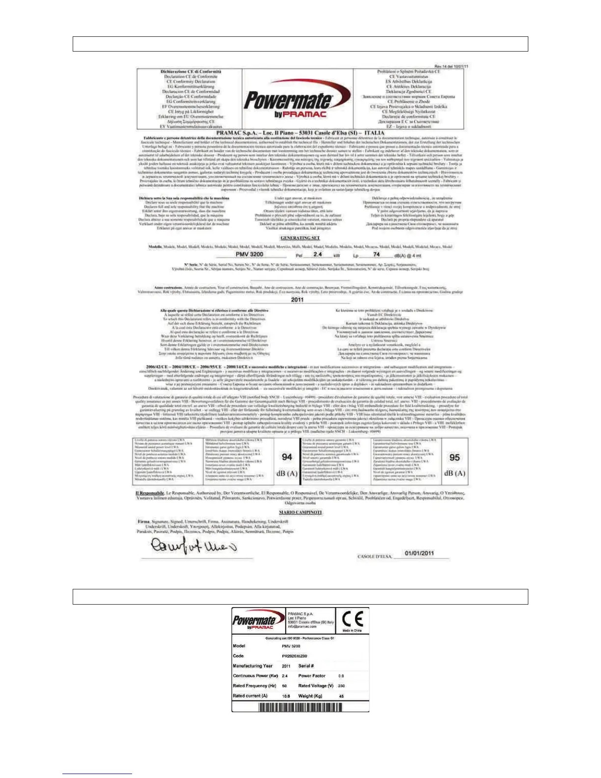 Powermate PMV 3200 - CE Declaration; Serial Number Plates