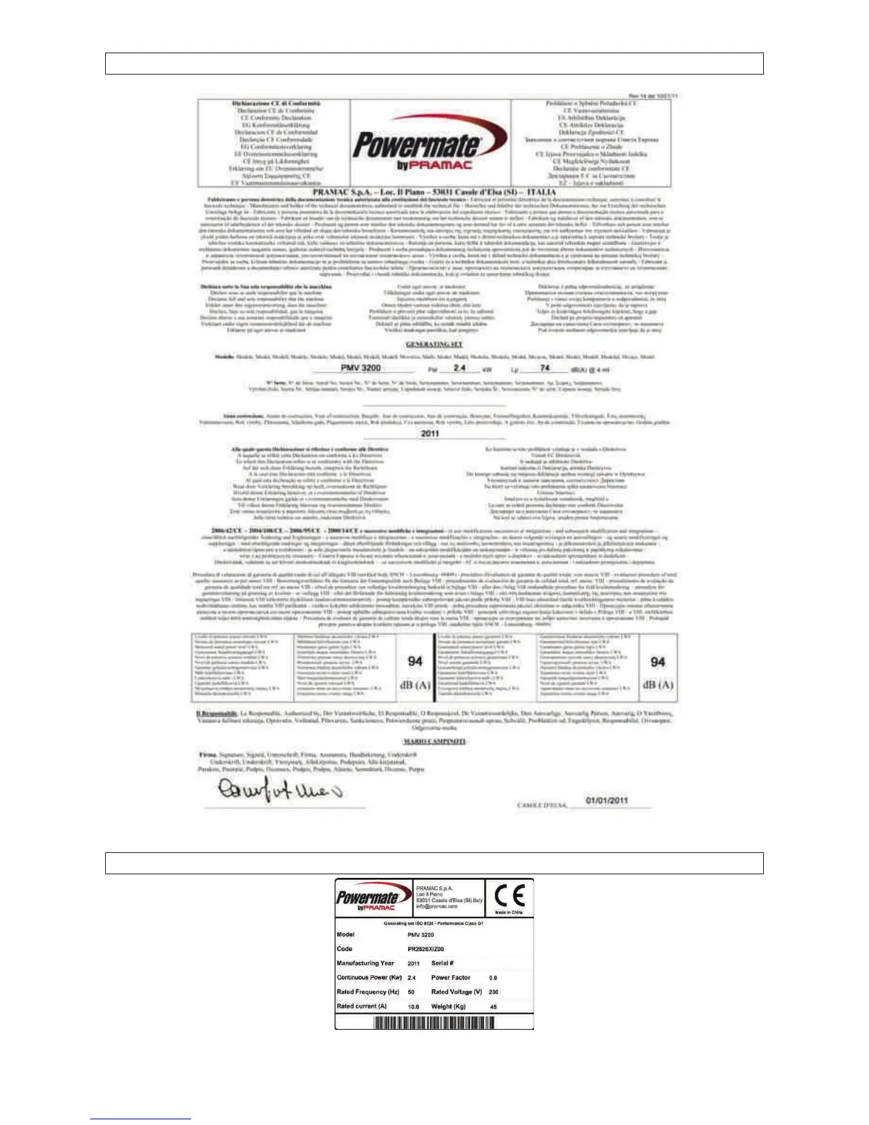 Powermate PMV 3200 - Declaración Ce de Conformidad; Placa de Identificación del Grupo Electrógeno