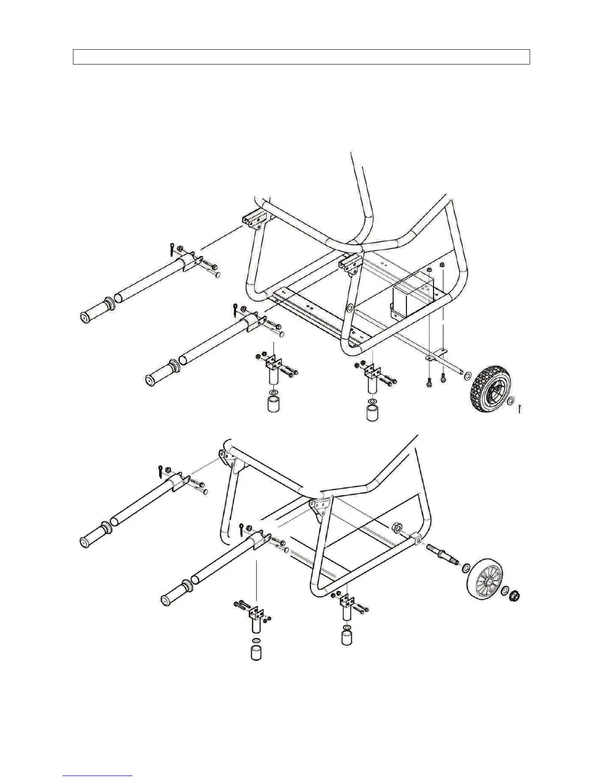 1. Instale las 2 ruedas en el eje posicionando las juntas y los pasadores