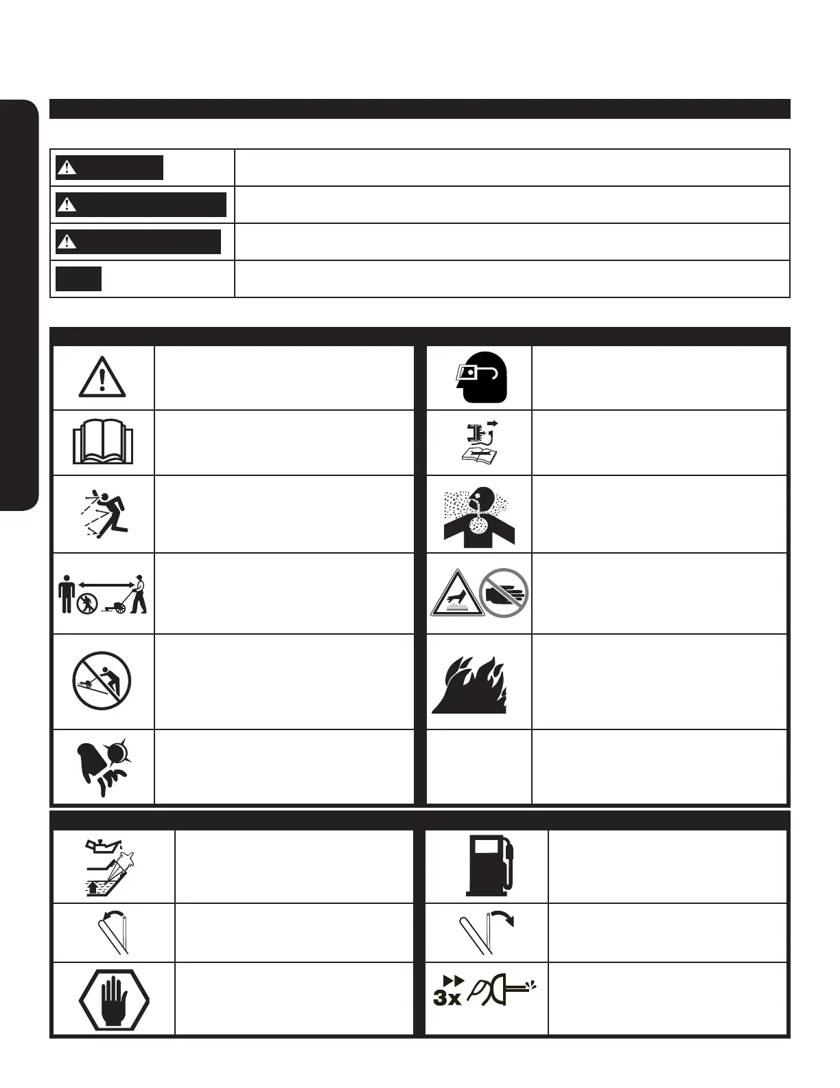 Les symboles suivants peuvent se rapporter à la sécurité et peuvent se retrouver sur votre débroussailleuse. Assurez-vous de les lire