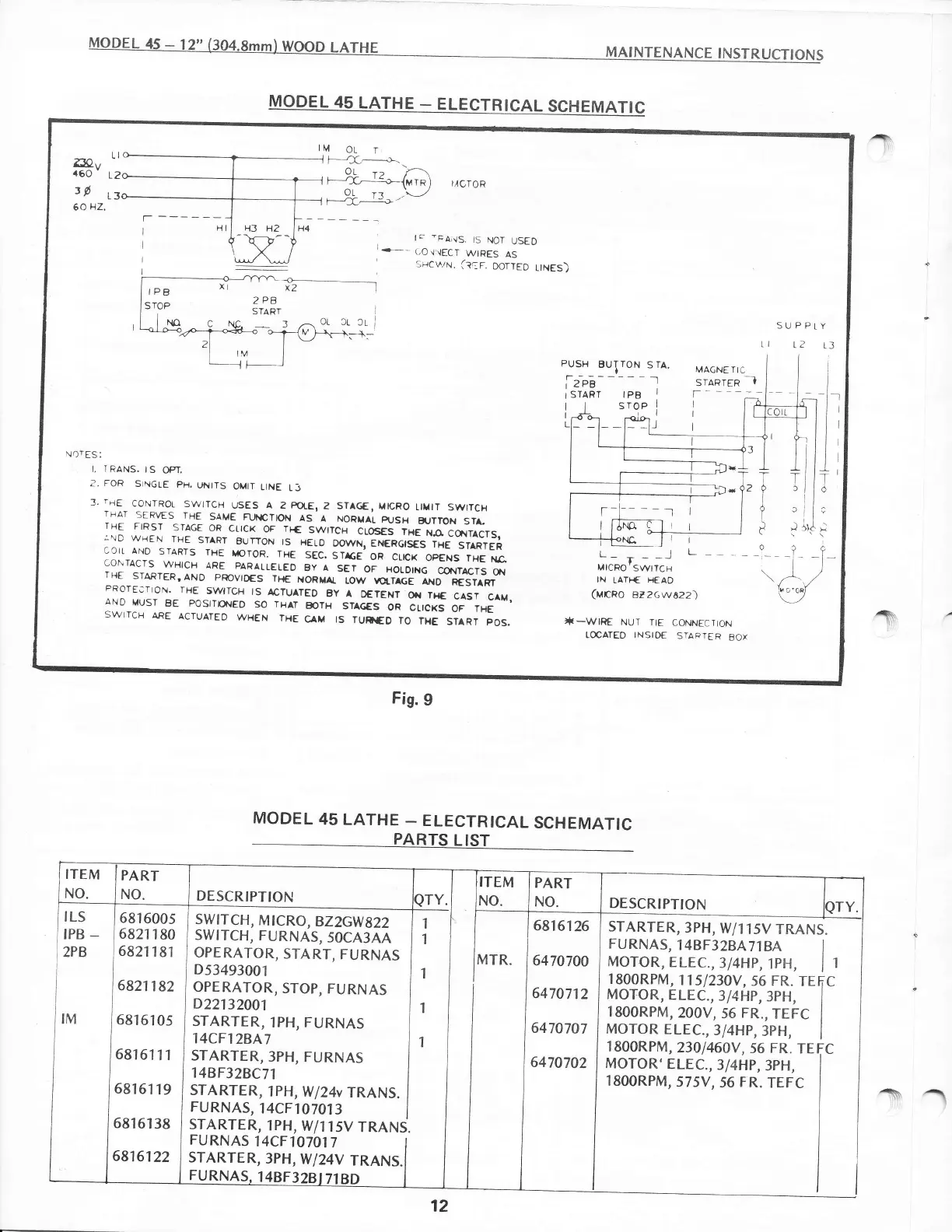 Powermatic 45 - Electrical Schematics and Parts; Electrical Wiring Diagram; Electrical Component List