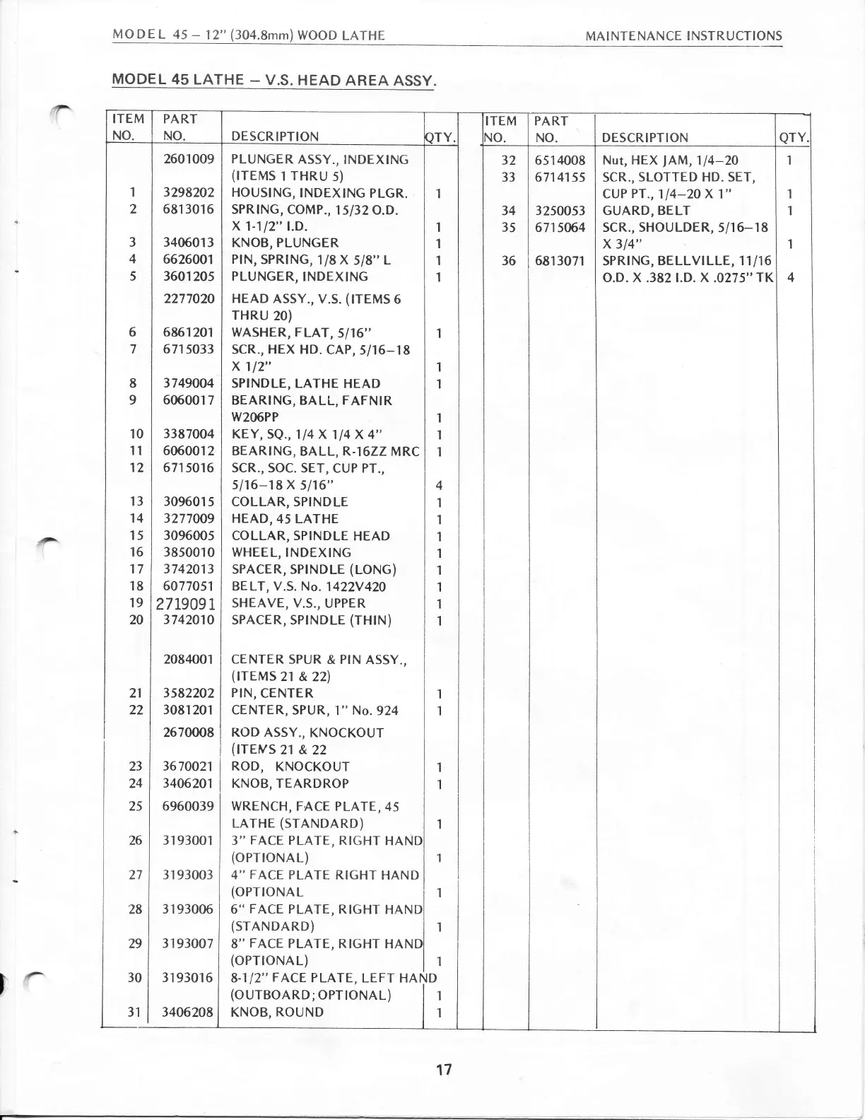 Powermatic 45 - V.S. Head Assembly Parts List; Detailed Parts for V.S. Head