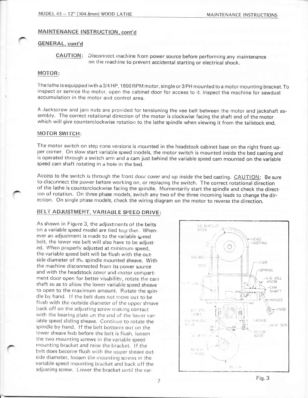 Powermatic 45 - Motor and Belt Systems; Motor Operation and Switch Details; Variable Speed Belt Adjustment