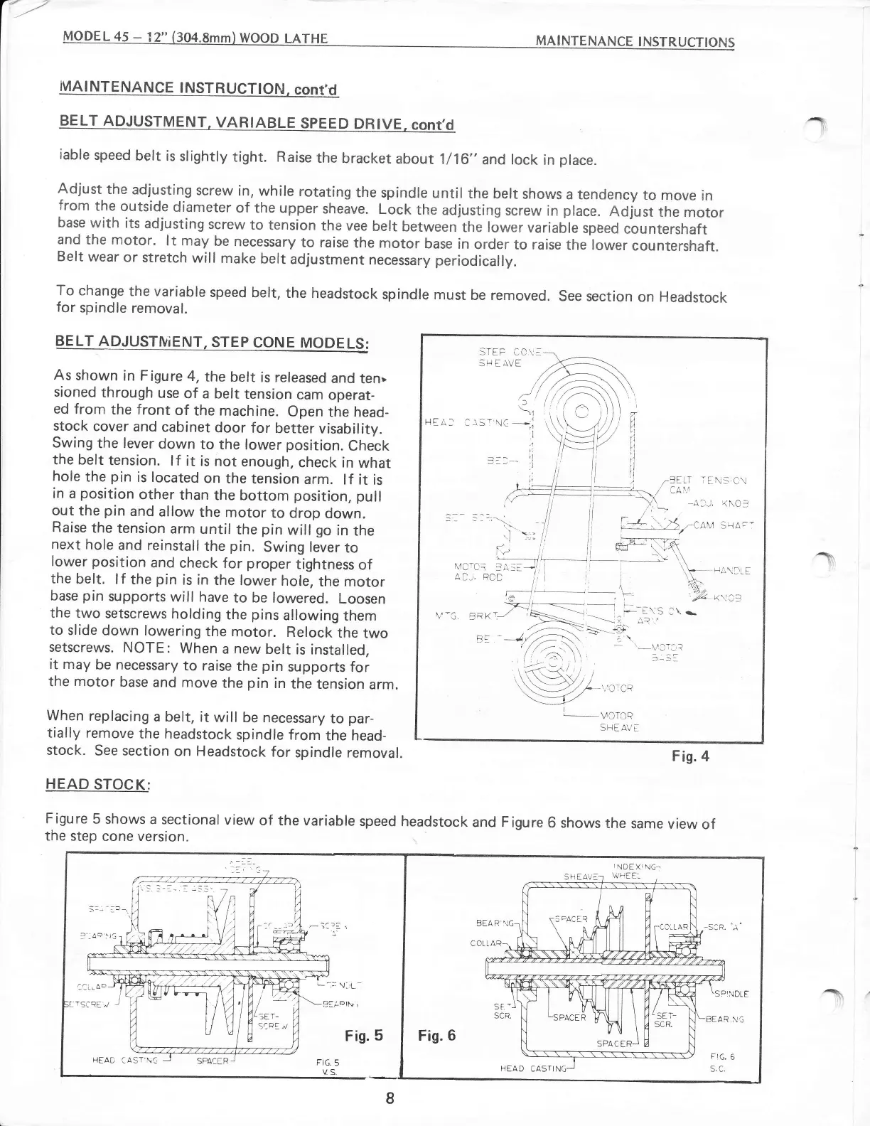 Powermatic 45 - Belt Adjustment and Headstock; Step Cone Belt Tensioning; Headstock Spindle Removal