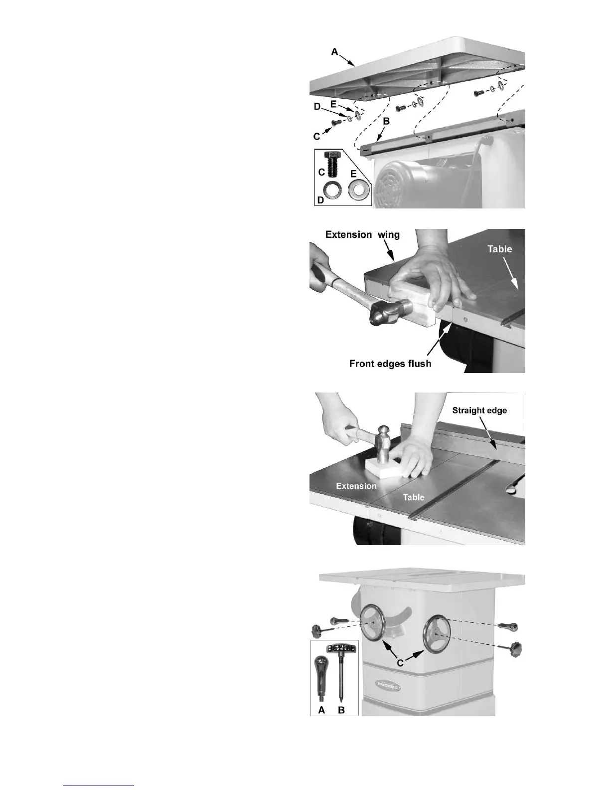 1. Mount a cast iron extension wing (A) to the