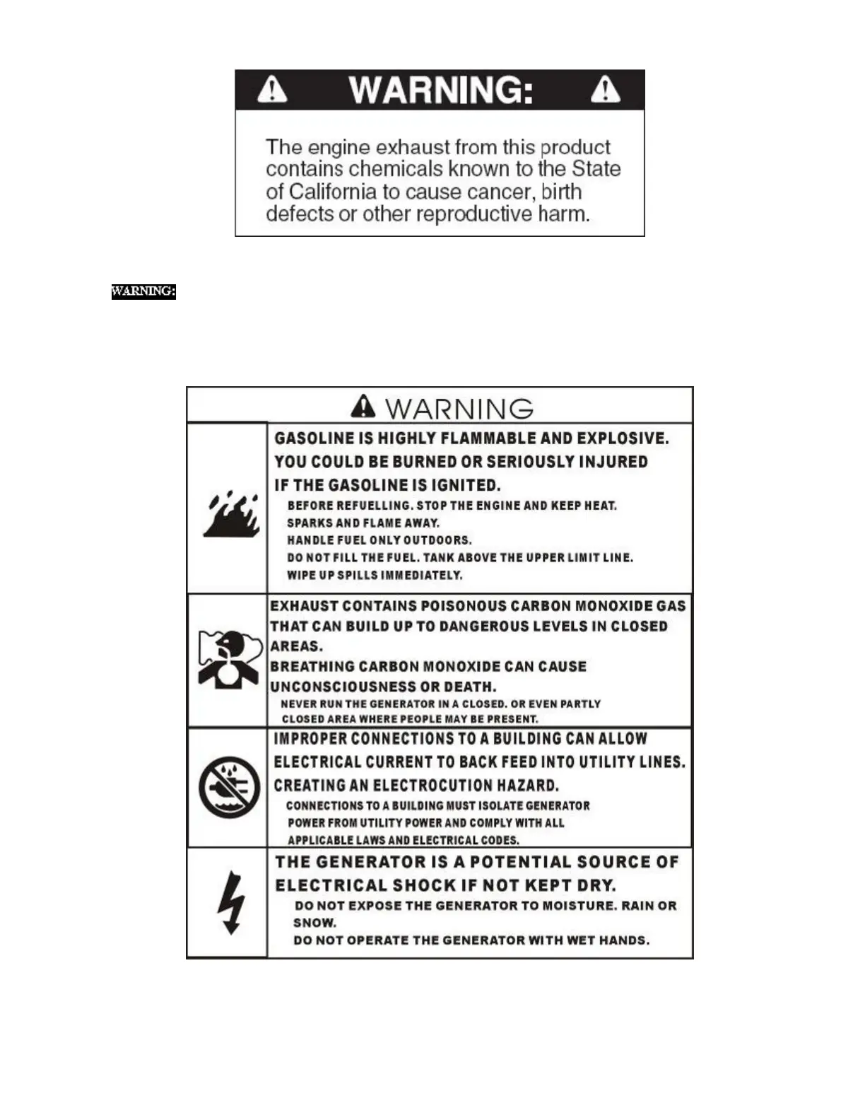 moisture, rain or snow. Do not let the generator get wet, and do not operate it with wet hands.