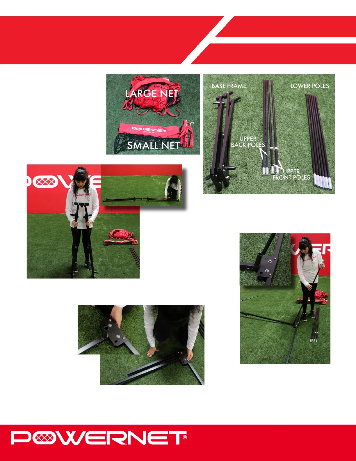 PowerNet V001 - Assembly Instructions: Base Frame and Poles; Step 1: Unfold Base Frame; Step 2: Secure Base Frame Legs; Step 3: Insert Lower Poles
