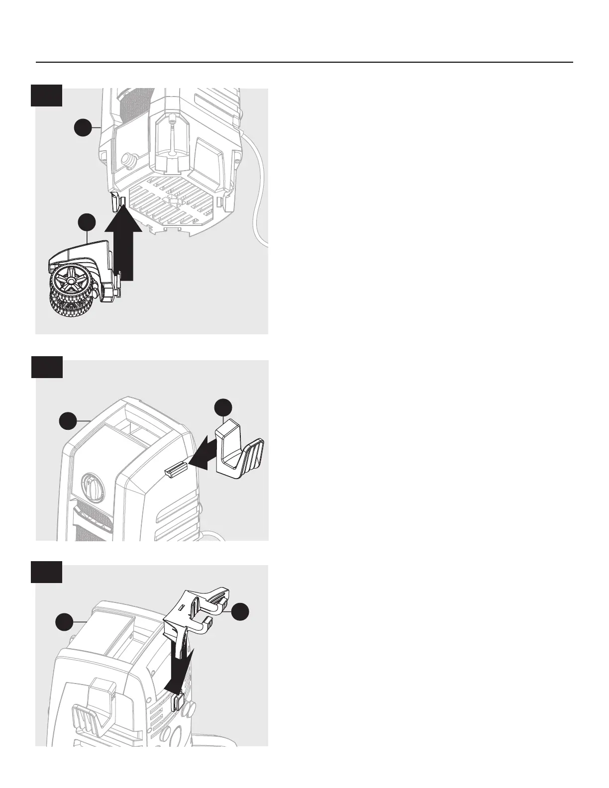 Slide hose holder (E) onto tab on the right side of power