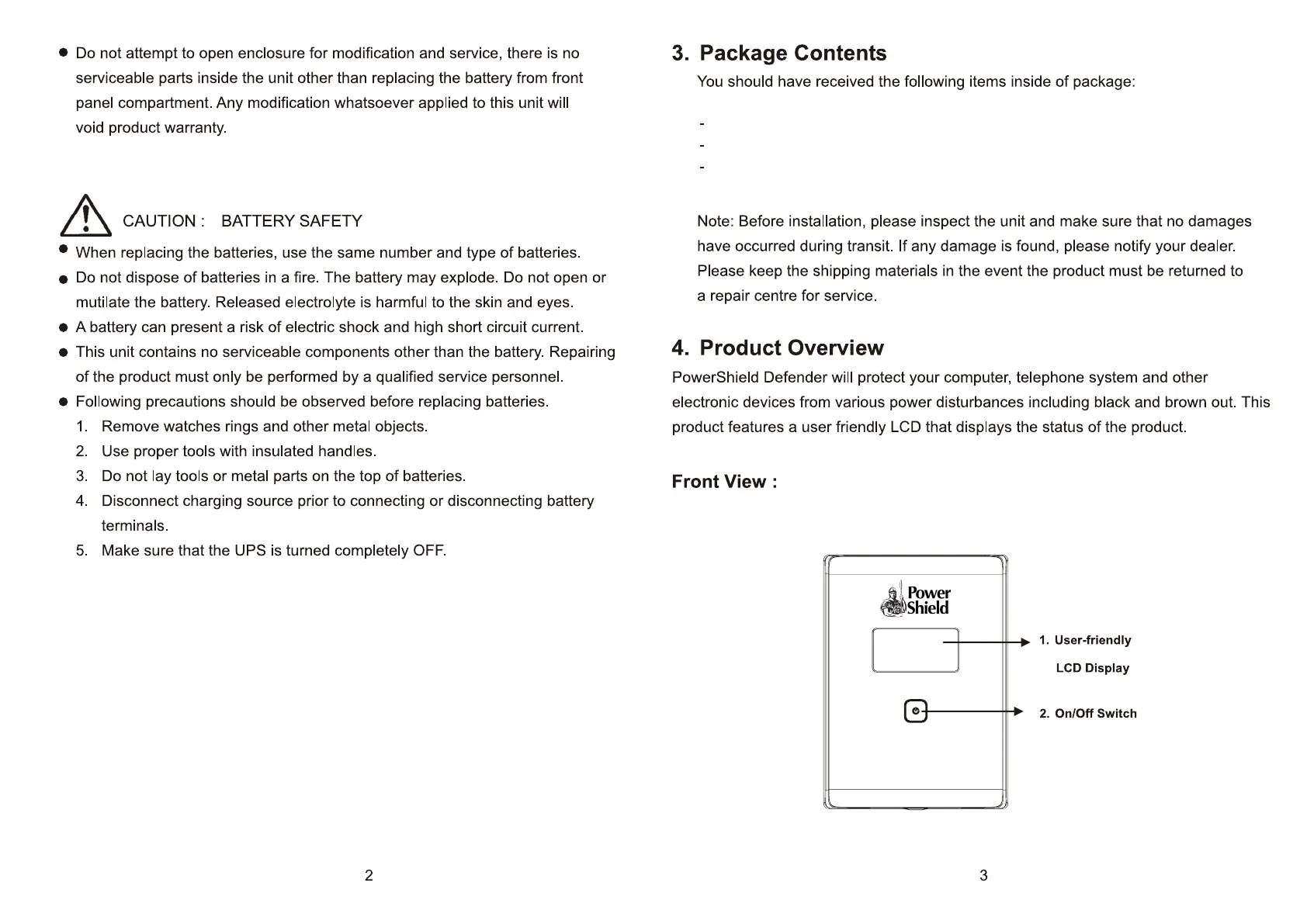 PowerShield Defender Series - Battery Safety Guidelines; Package Contents; Product Overview; UPS Front Panel Components