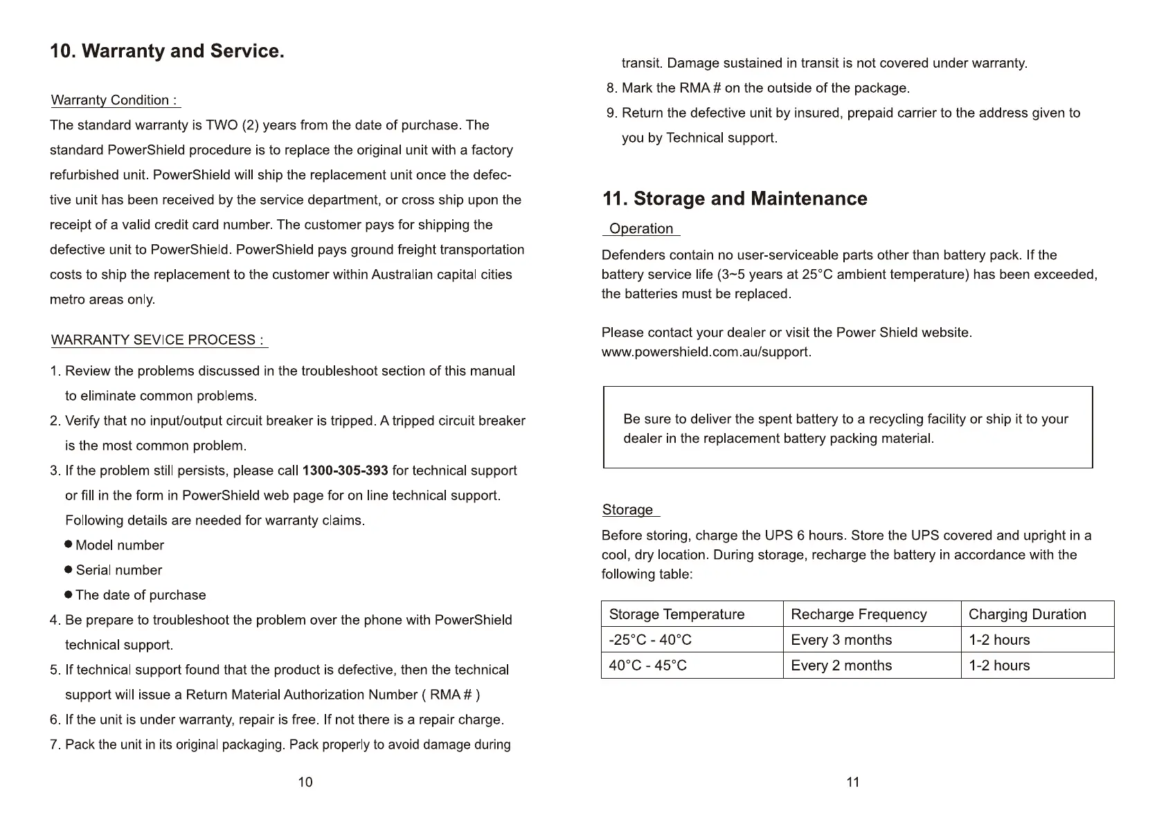 PowerShield Defender Series - Warranty and Service; Storage and Maintenance