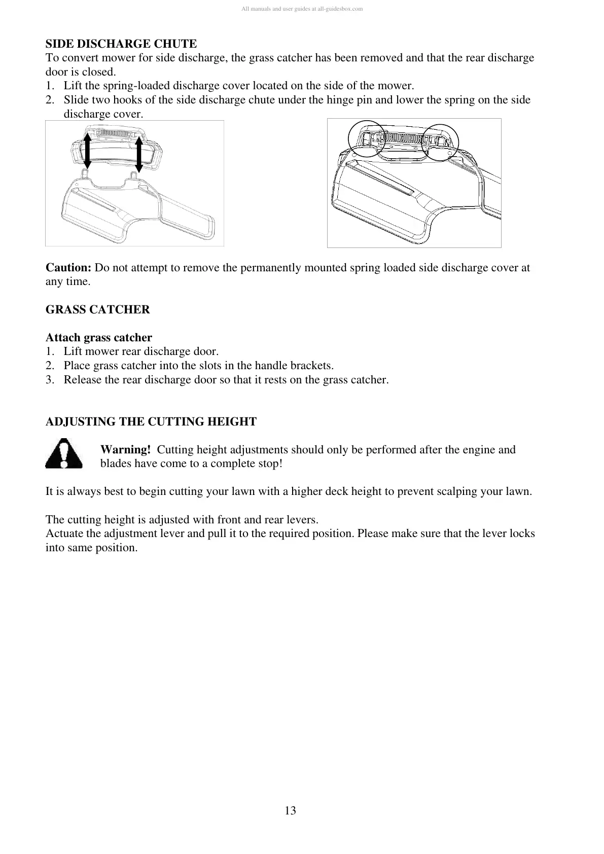 Caution: Do not attempt to remove the permanently mounted spring loaded side discharge cover at