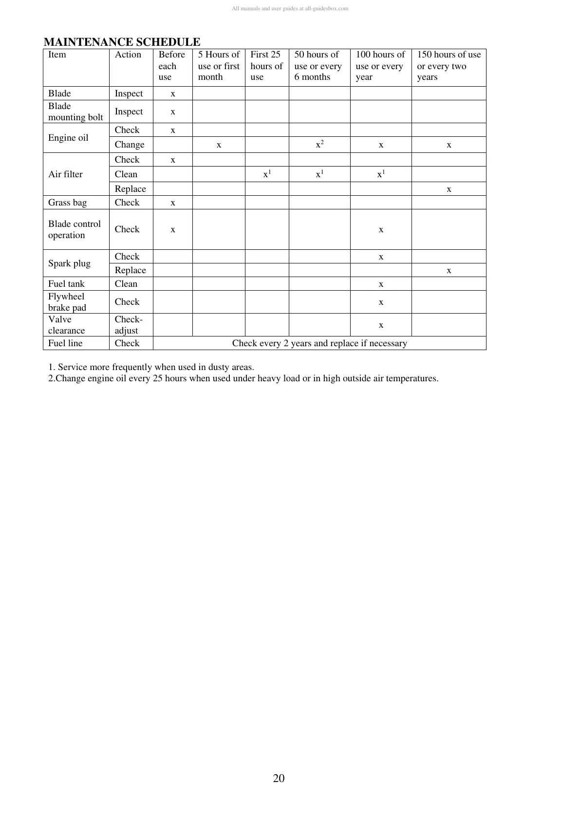 2.Change engine oil every 25 hours when used under heavy load or in high outside air temperatures.