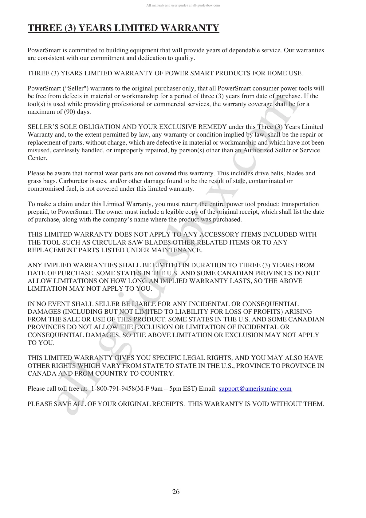 THREE (3) YEARS LIMITED WARRANTY OF POWER SMART PRODUCTS FOR HOME USE.