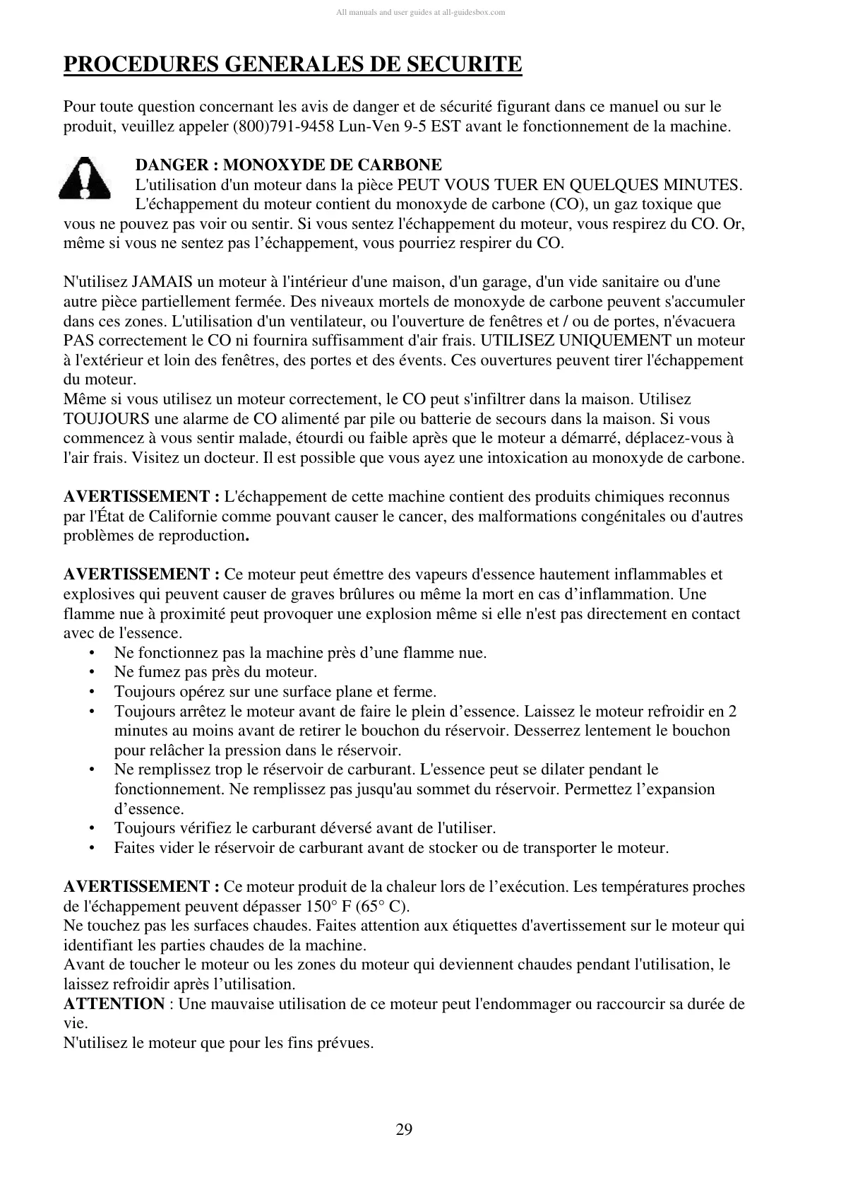PAS correctement le CO ni fournira suffisamment d'air frais. UTILISEZ UNIQUEMENT un moteur