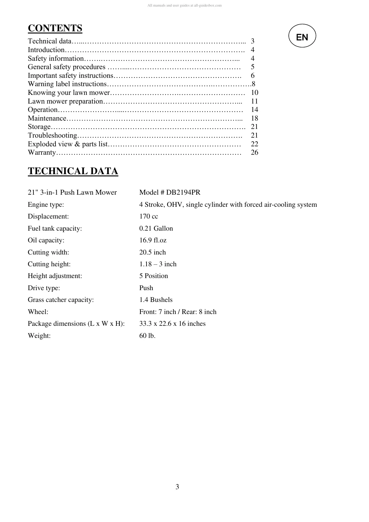 21" 3-in-1 Push Lawn Mower Model # DB2194PR