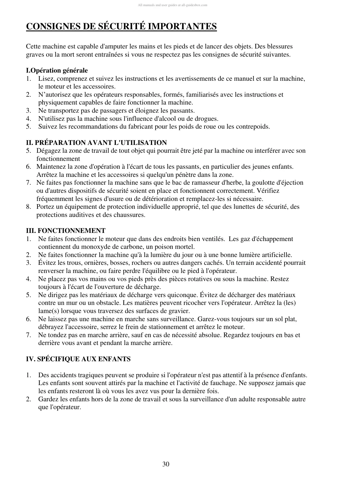 7. Ne faites pas fonctionner la machine sans que le bac de ramasseur d'herbe, la goulotte d'éjection