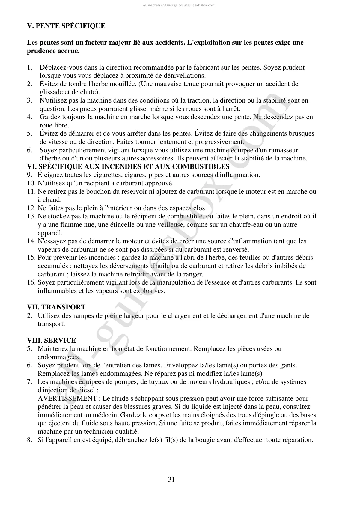 3. N'utilisez pas la machine dans des conditions où la traction, la direction ou la stabilité sont en