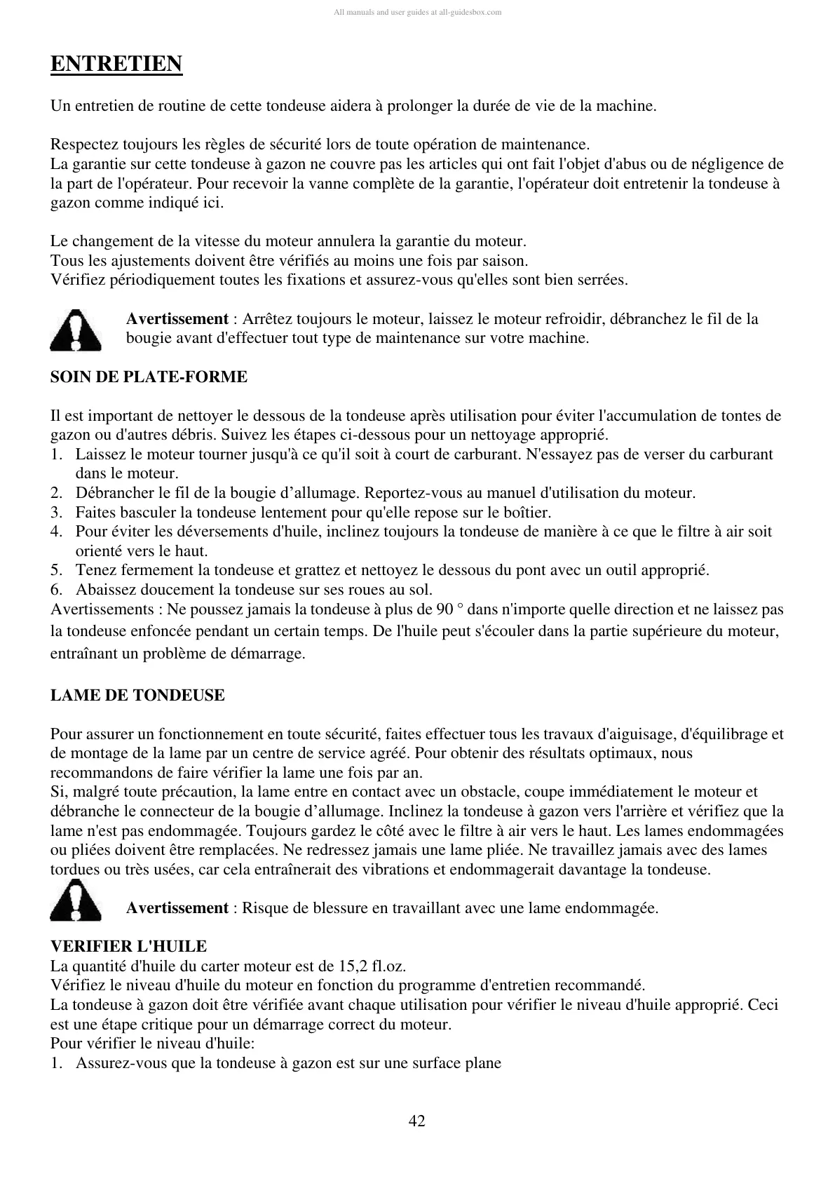 la part de l'opérateur. Pour recevoir la vanne complète de la garantie, l'opérateur doit entretenir la tondeuse à