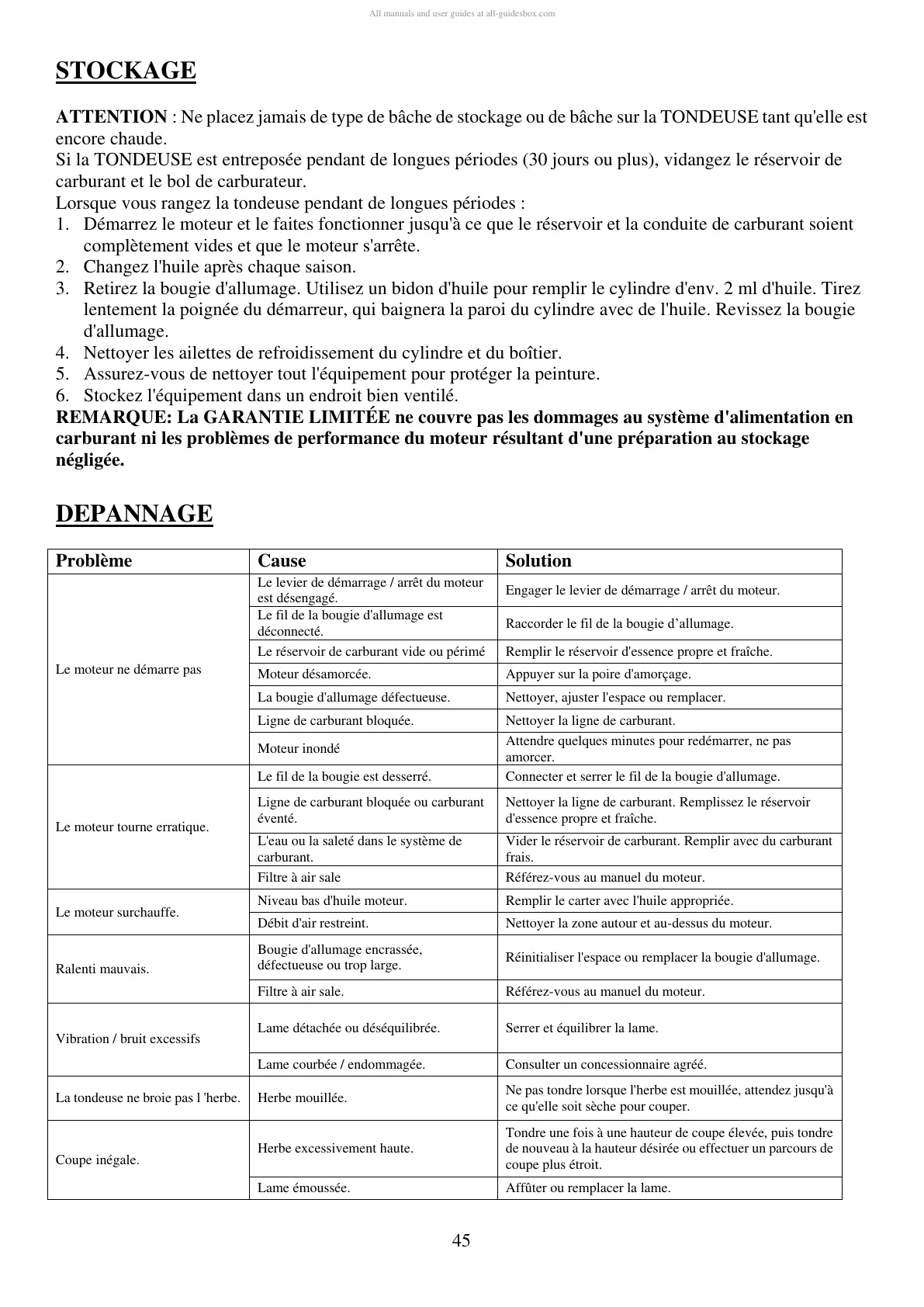 Si la TONDEUSE est entreposée pendant de longues périodes (30 jours ou plus), vidangez le réservoir de