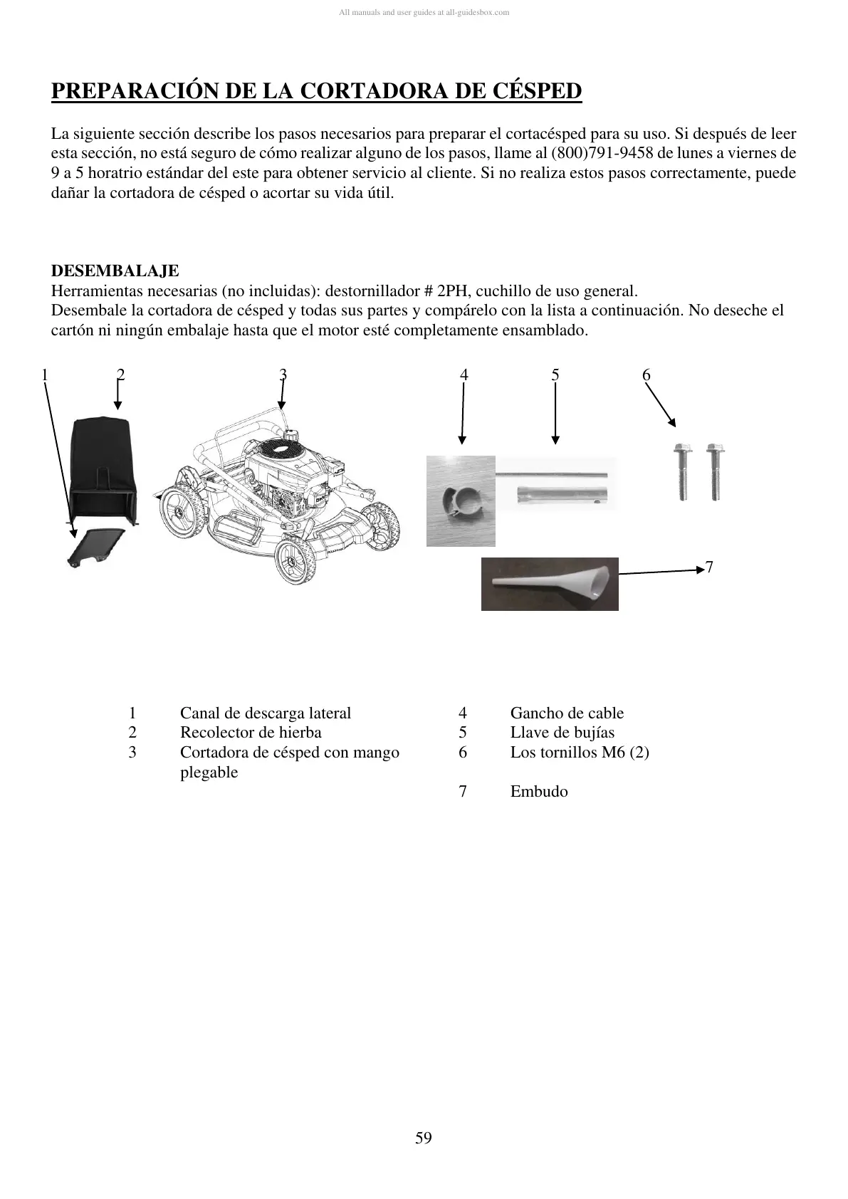 Desembale la cortadora de césped y todas sus partes y compárelo con la lista a continuación. No deseche el