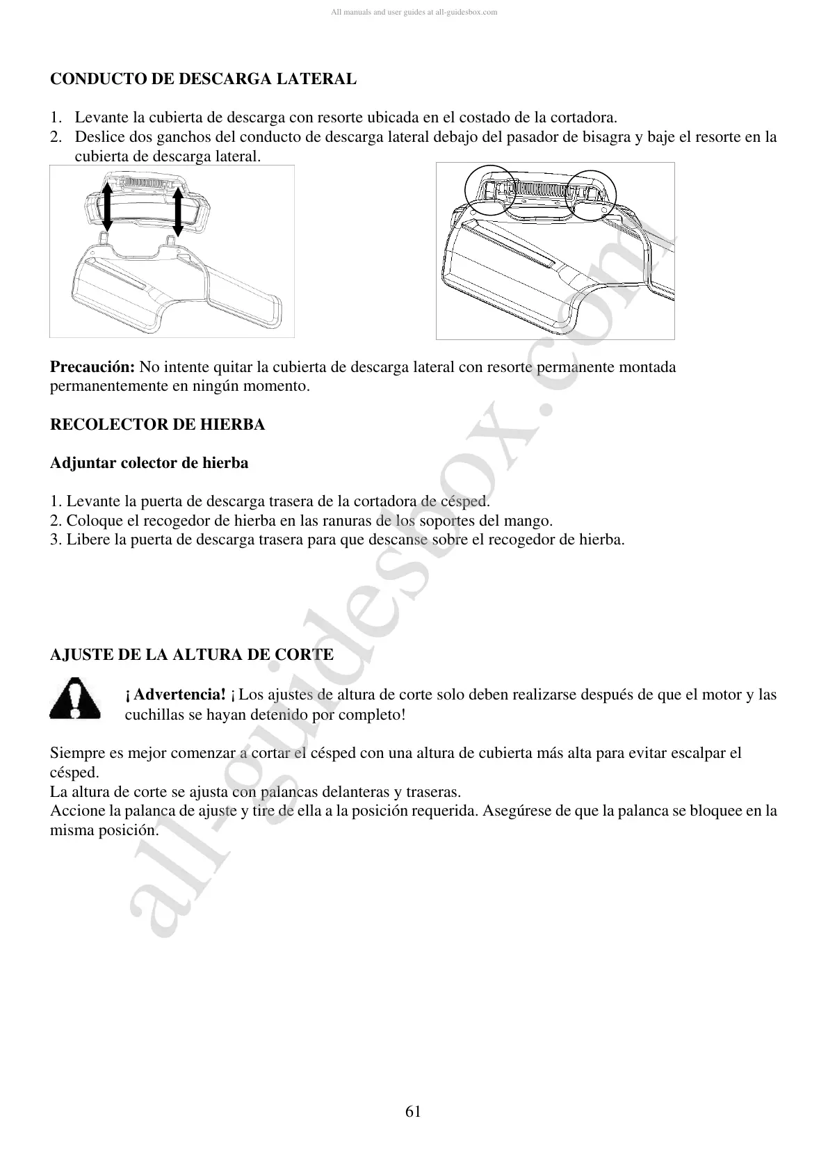 ¡Advertencia! ¡Los ajustes de altura de corte solo deben realizarse después de que el motor y las