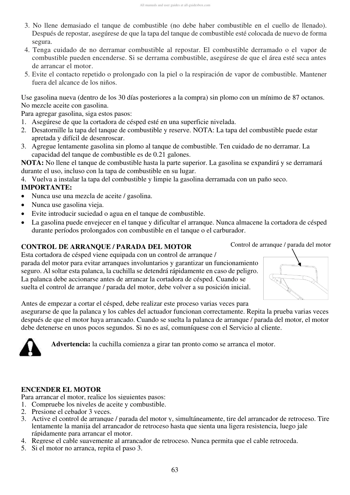 Advertencia: la cuchilla comienza a girar tan pronto como se arranca el motor.