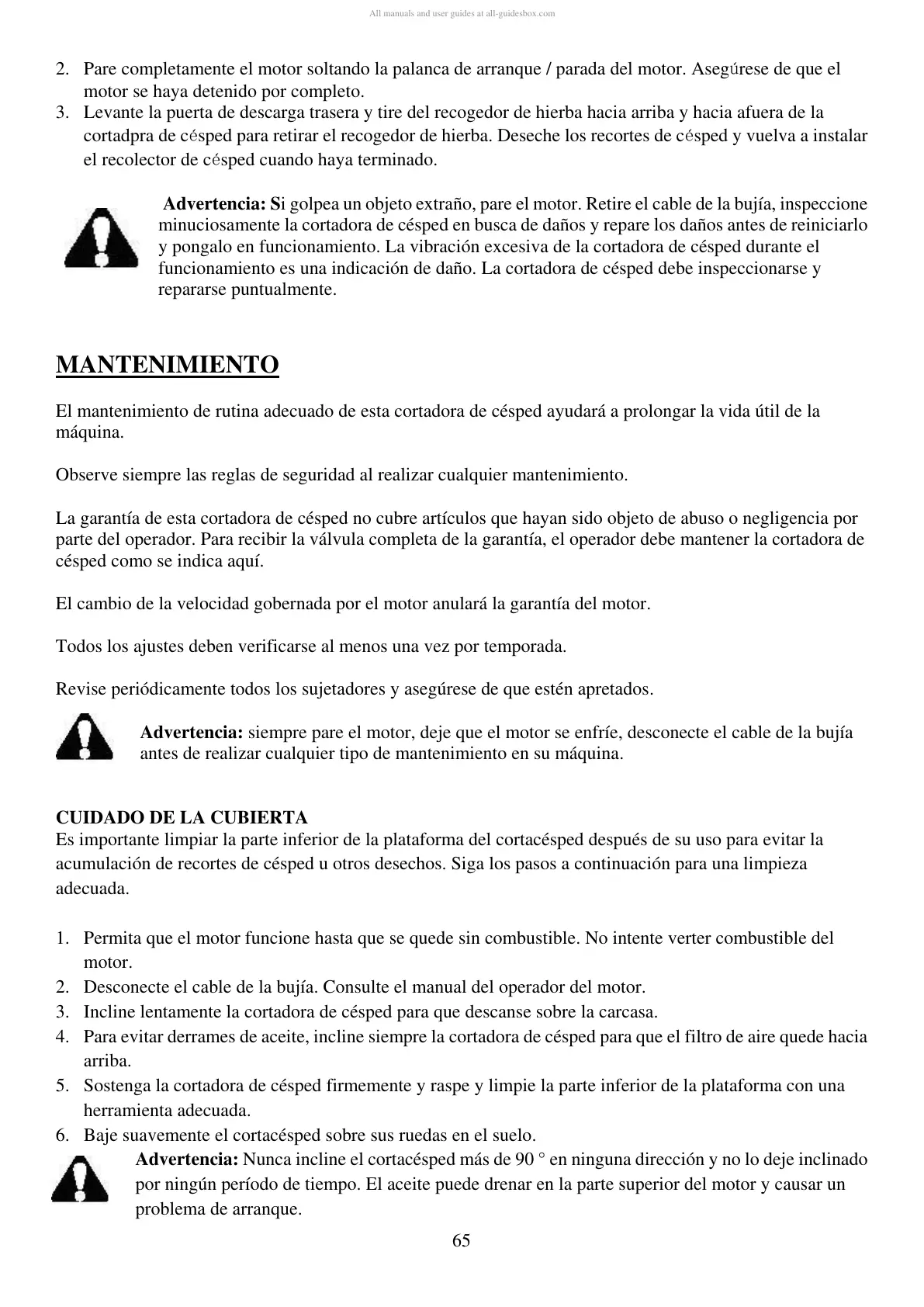 El mantenimiento de rutina adecuado de esta cortadora de sped ayudará a prolongar la vida útil de la