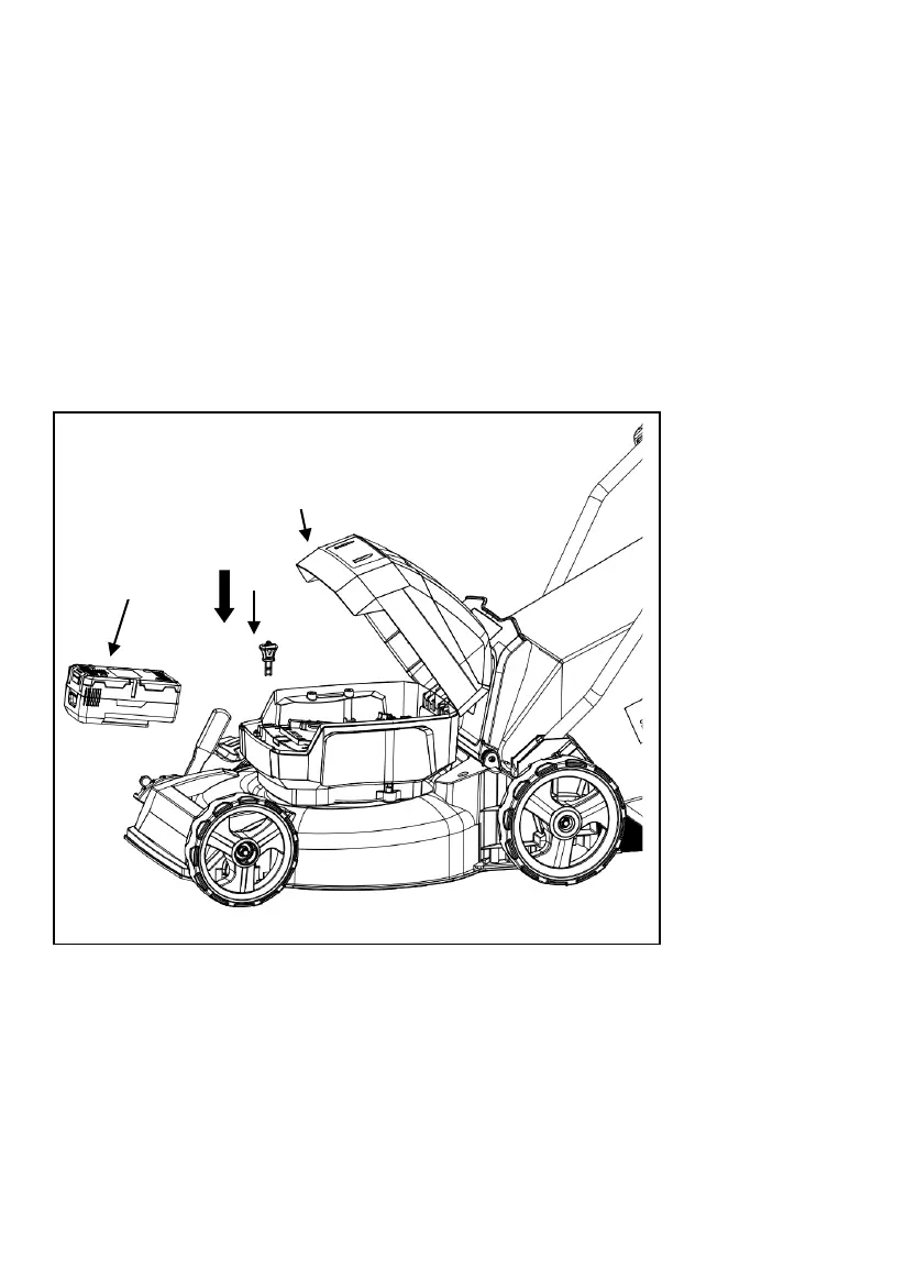 • Placez le bloc-batterie sur la tondeuse. Alignez les nervures guidées du bloc-batterie