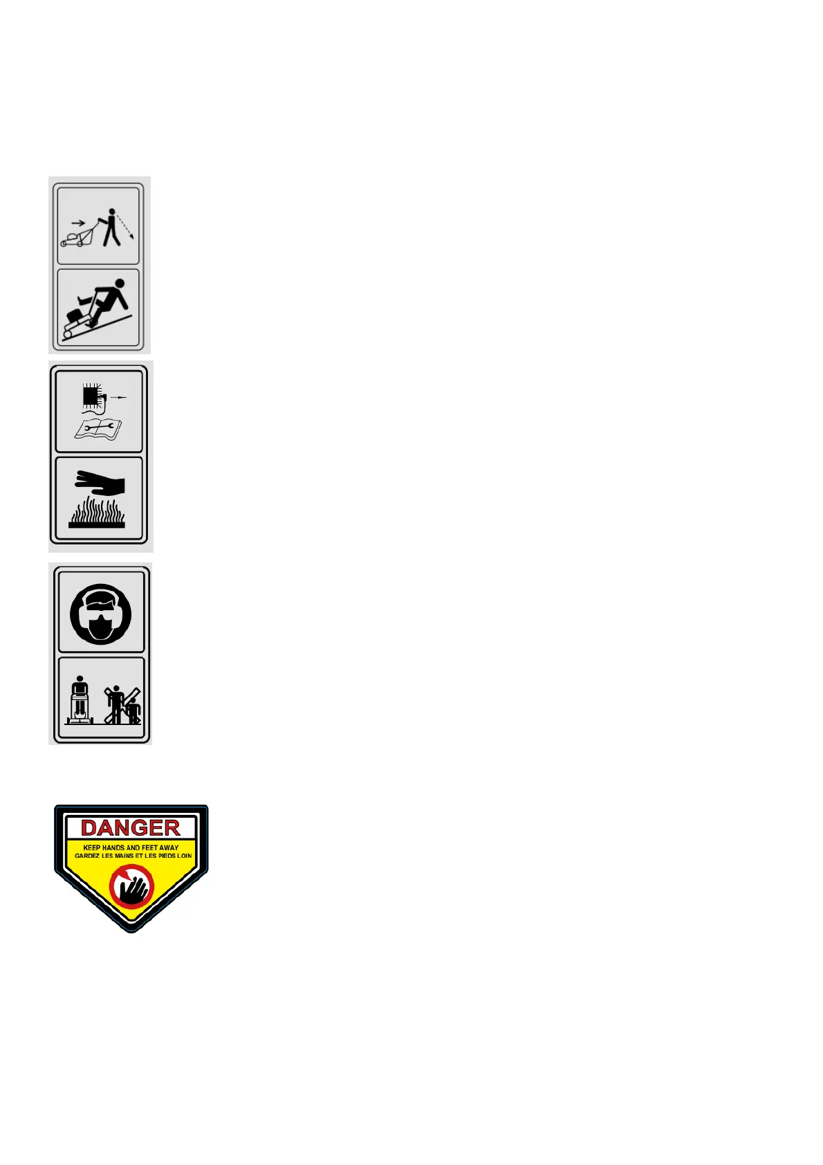 Warning: Keep the safety signs clear and visible on the equipment.Replace the safety signs if they are missing or
