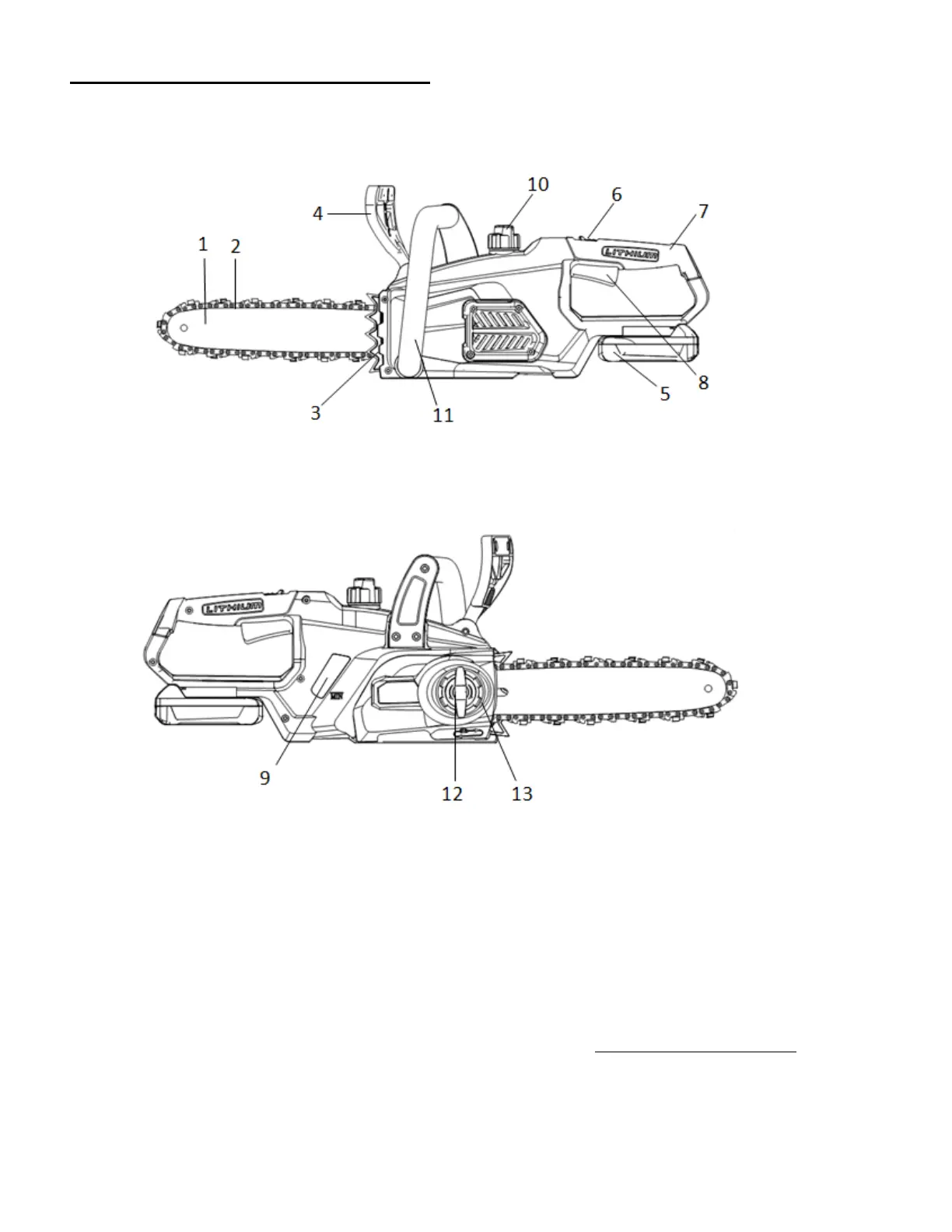 1. Guide Bar 5. Lithium Battery Pack Knob 10. Oil Tank Cap
