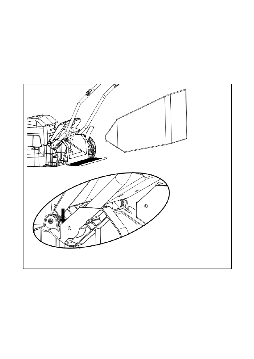 • Lift the grass catcher by its handle (2) and place under the chute cover so that the