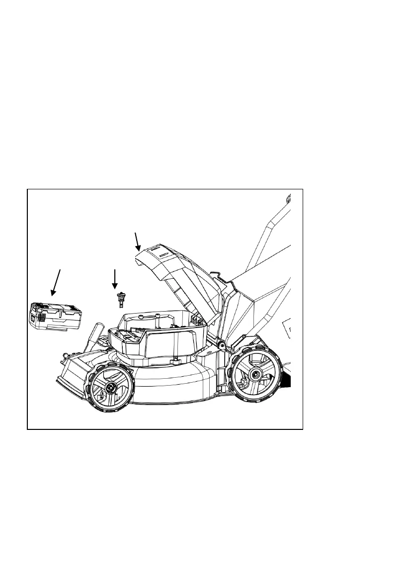 • Coloque la batería en el cortacésped. Alinee las costillas guiadas en la batería con