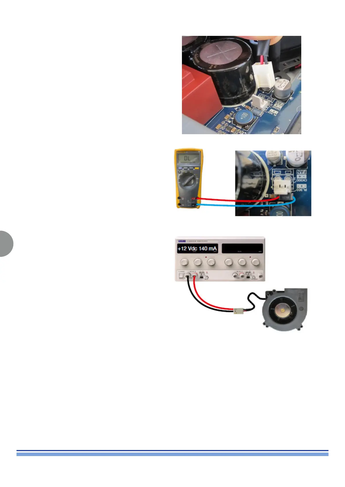 Connect the fan to a DC power supply, and check its