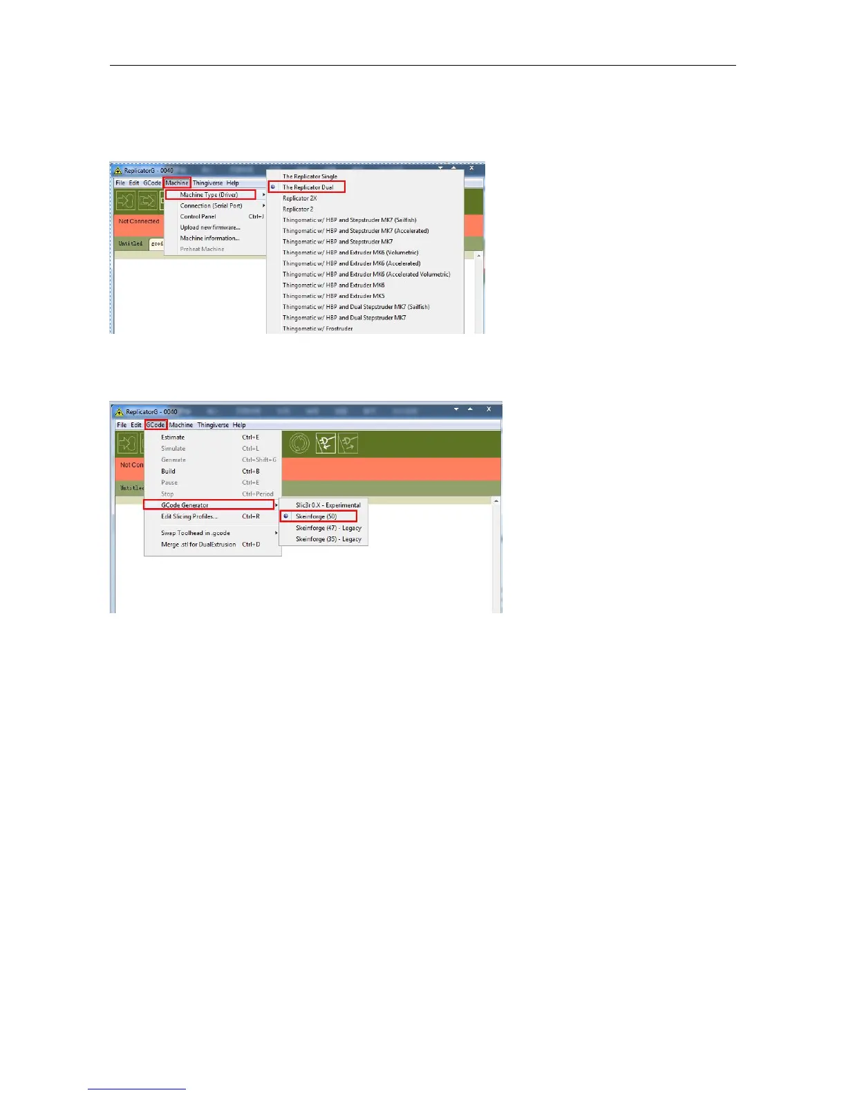 After opening ReplicatorG software, click on Machine to select your Machine Type. Choose The Replicator Dual for 3D